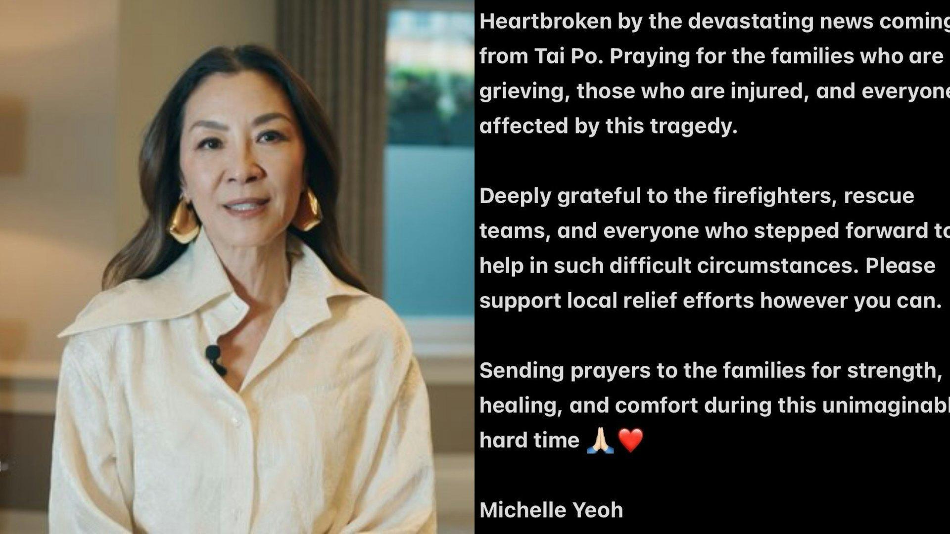 杨紫琼发文:“听到大埔传来的噩耗,我心碎不已。我为悲痛的家属、受伤的人们以及所有受这场悲剧影响的人祈祷。衷心感谢消防员、救援队以及所有在如此艰难的情况下挺身而出提供帮助的人们。请尽你所能支持当地的救援工作。为这些家庭祈祷,愿他们在这段难以想象的艰难时期获得力量、治愈与慰藉。”