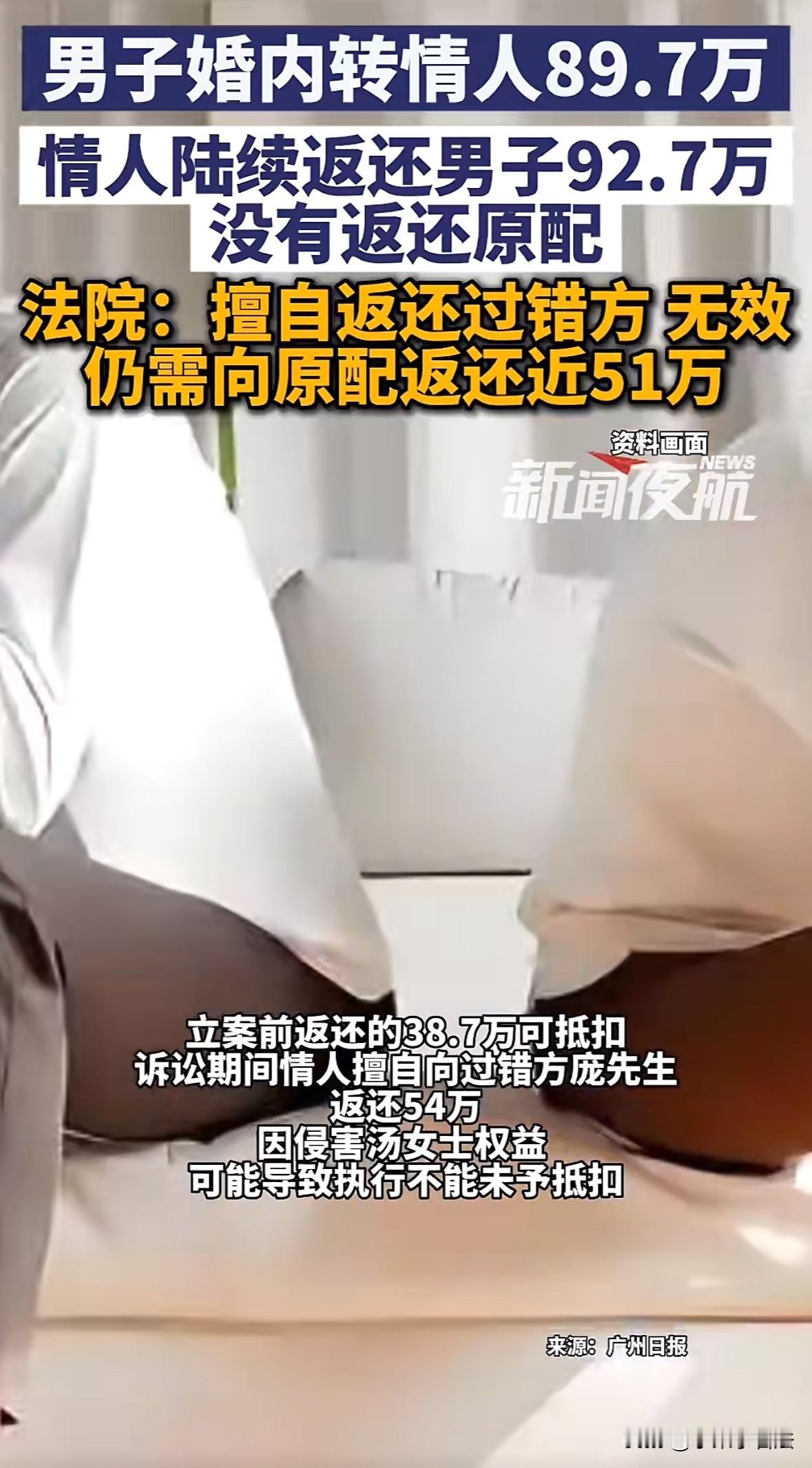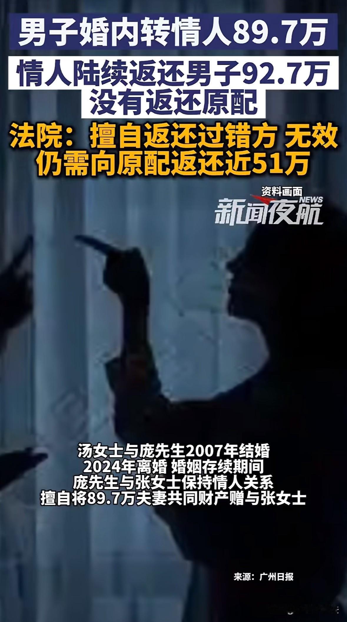 四川达州,女子在离婚后得知,男子在婚姻存续期间长期与情人保持不正当男女关系,还多次转账高达89.7万,于是起诉男子和情人返还。情人在法院立案前后陆续还给男子92.7万,可法院开庭后却判决情人还需要返还51万元,只因女子没收到钱。   汤女士与庞先生结婚17年,最终还是没能走到最后,选择离婚各自安好。但是在离婚后,汤女士却发现庞先生给情人转账将近90万元,而她却毫不知情。   汤女士和庞先生是2007年12月21日登记结婚的,婚后的生活虽然没有过得轰轰烈烈,但也足够幸福安宁。   庞先生因工作原因经常会出差在外,家里的大事小情都是汤女士负责照顾打点。   男主外女主内的日子一过就是十几年,渐渐的庞先生对家庭的付出越来越少,两个人的争吵也越来越多。   缺少沟通机会和条件的两个人,慢慢的就把感情吵没了,最后不得不选择离婚。   离婚时约定好的孩子抚养费用和财产分割,却在离婚后迟迟都没有兑现。每次问庞先生都说没钱,但是孩子和家里哪哪都需要用钱,汤女士可等不得。   汤女士不理解,多年来她都没有让庞先生给自己花过什么钱,而且庞先生的收入不菲,那么钱都去哪了呢?   汤女士越想越觉得不对劲,于是将庞先生起诉至法院,申请财产保全,调查一番,发现庞先生多年的秘密。   原来庞先生一直与张女士长期保持着不正当男女关系,而且在交往期间还多次发生转账,最过分的一次转账66666.66元,仅仅是为了给张女士过生日。   汤女士经过调查发现,庞先生通过微信、支付宝、银行账户等,频繁向张女士转账、发送红包或代付等方式赠与共计896995.55元。   光是包含特殊数字金额的转账就数不胜数,每次转账还都有附言,汤女士看了那些话都羞得慌。   要不是庞先生拿不出钱支付抚养费用,汤女士可能一直都被埋在鼓里。汤女士十分气愤,是她的东西就一定要要回来,于是就将庞先生和张女士告上法院,起诉返还。   庞先生在知道汤女士起诉后,就赶紧联系张女士商量对策。   两个人对了一下曾经的过往转账记录,发现庞先生给张女士转账89.7万元,但是张女士也给庞先生转账过38.7万元。   计算一下差价,只要张女士在还给庞先生51万元就够了。于是张女士在开庭前一天和开庭当天,以及后面几天,共计给庞先生转账54万元,比51万还多出3万。   反正张女士和庞先生的关系并没有任何变化,两个人的钱谁给谁都一样,总归不落到外人手里就好。   在庭审当天,汤女士主张张女士和庞先生返还89.7万元,因那是属于婚姻存续期间都夫妻共同财产。   根据《民法典》第1062条的规定:夫妻在婚姻关系存续期间所得的下列财产,为夫妻的共同财产,归夫妻共同所有:   (一)工资、奖金、劳务报酬; (二)生产、经营、投资的收益; (三)知识产权的收益; (四)继承或者受赠的财产,但是本法第一千零六十三条第三项规定的除外; (五)其他应当归共同所有的财产。   夫妻对共同财产,有平等的处理权。   在没有得到汤女士的同意下,庞先生私自处理夫妻共同财产,侵犯了汤女士的合法权益,所以汤女士要求张女士和庞先生返还89.7万元。   虽然汤女士已经和庞先生离婚,但是89.7万元仍然属于是夫妻存续期间内的财产,张女士返还后,汤女士和庞先生才可以对该笔财产重新进行分割。   但是张女士却提交了转账证明,证明自己已经向庞先生归还了92.7万元,高于庞先生给张女士转账的89.7万元,不需要再归还任何数额的钱款。   张女士提交的材料里,其中387005元是张女士从2019年到2023年陆续给庞先生转账的数额,剩余的款项均是在开庭前才归还的。   法院审理后认为:   根据《民法典》第157条的规定:民事法律行为无效、被撤销或者确定不发生效力后,行为人因该行为取得的财产,应当予以返还;不能返还或者没有必要返还的,应当折价补偿。   有过错的一方应当赔偿对方由此所受到的损失;各方都有过错的,应当各自承担相应的责任。法律另有规定的,依照其规定。   张女士和庞先生长期保持不正当男女关系,还多次进行转账,均是在未经过汤女士的前提下进行的,侵害了汤女士的合法权益。   由于庞先生在侵犯汤女士合法权益的前提下转账给张女士89.7万元,违背了公序良序原则,应将89.7万元予以归还。   汤女士认可387005元的转账为归还的款项,但是剩余的509990.55元却不能被认定为归还的款项,因为汤女士没有收到钱。   汤女士和庞先生存在抚养费纠纷和财产纠纷,诉讼保全已基本保全到位。如果509990.55元予以抵扣,极有可能导致执行不能,且严重的浪费司法资源。   因此法院对于张女士在开庭前给庞先生转账的509990.55万元不予认可为归还的款项,因此法院判决,张女士还应归还给汤女士509990.55元。