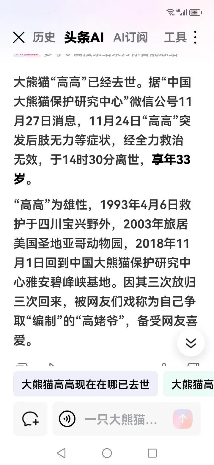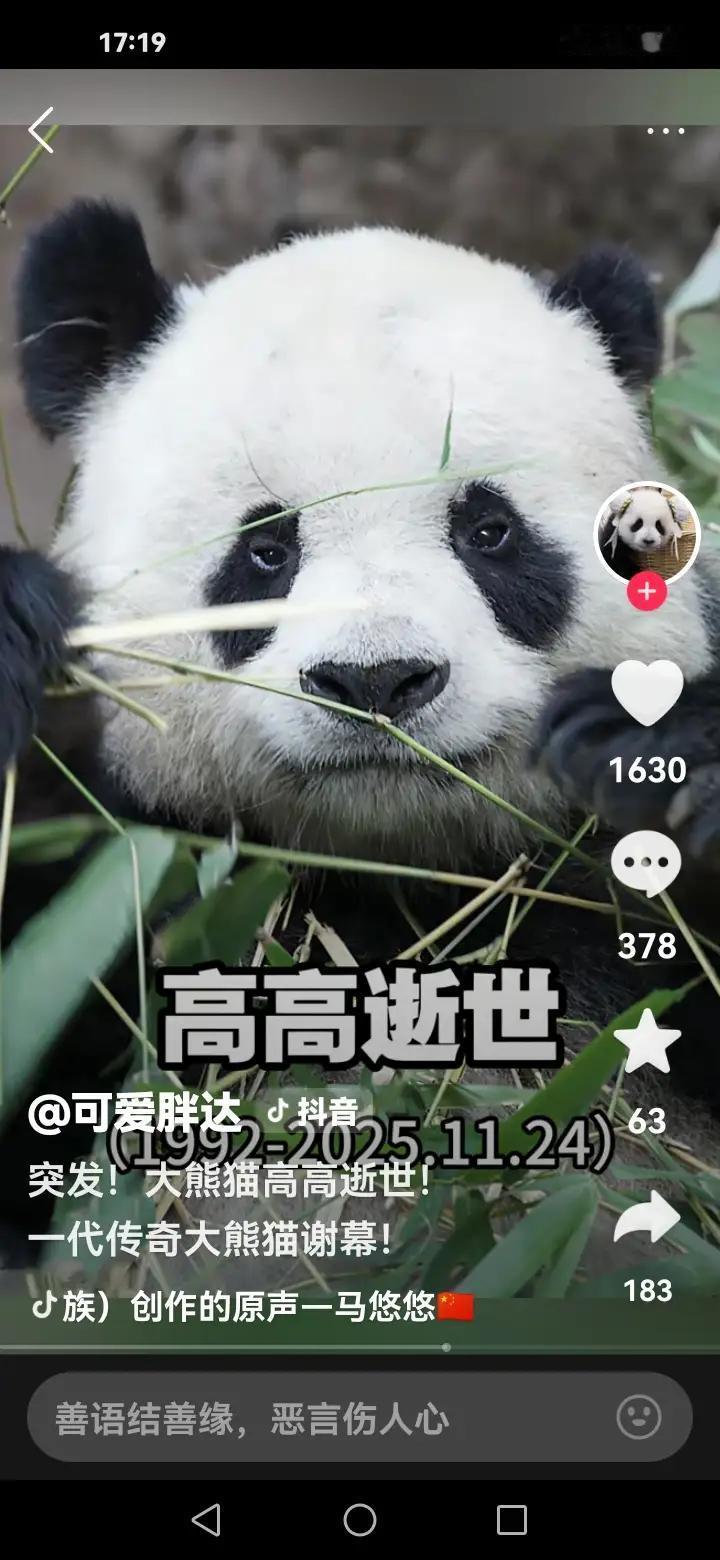 当然,以下是一篇关于大熊猫高高离世的感怀文章,表达对它的缅怀与哀思: 大熊猫高高离世:一段美好的回忆永存心间 11月24日,大熊猫保护中心宣布了令人惋惜的消息:可爱的高高在生命的最后时刻,突然四肢无力,经全力抢救后仍未能挽回生命,离开了我们,去了“潘达星”。 高高,是许多人心中的萌宠与象征。它那圆润的身躯、憨态可掬的模样,曾带给无数人欢乐与温暖。每一次看到高高的身影,仿佛都能感受到它纯真的眼神和无声的陪伴。 如今,高高已离开,但它留给我们的不仅仅是哀伤,更是一份珍贵的记忆。那些与它共度的时光,那份纯粹的喜悦,将永远铭刻在心底。 愿高高在“潘达星”安息。我们会继续努力保护每一只像高高一样的可爱生命,让它们在这片土地上自由自在、幸福安康。 高高,感谢你曾经带来的美好,你的离去让我们更加珍惜每一个生命的价值。愿你在天国平安无恙,永远活在我们的记忆中。 如果需要更正式或更感性的版本,我也可以帮你调整!