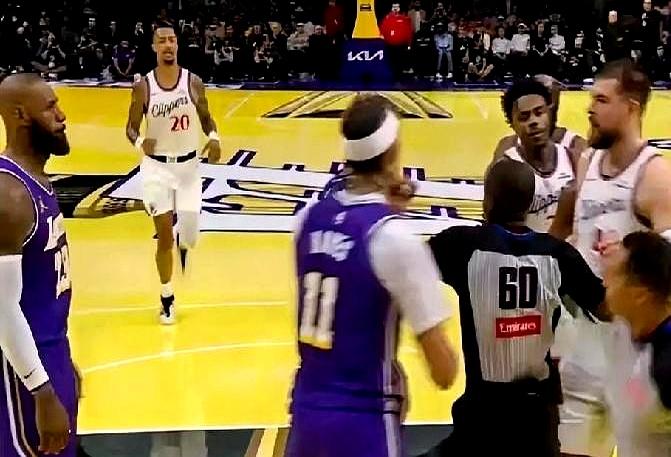 队友被欺负,爆发冲突,老詹默默退出战区,哈哈哈。 东契奇想造个犯规,反被邓恩推倒,他起身理论又被球怼。海斯瞧见自家兄弟吃亏,直接冲上去推了邓恩,这下就变成他俩的对峙了。 老詹这老江湖心里门儿清,他知道自己一掺和进去就得领个技术犯规,所以他就站在那儿看着,既没帮东契奇出头,也没上去拉架。