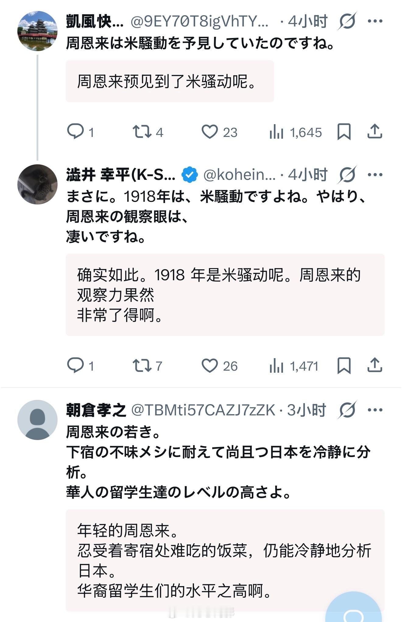 日本一网友贴出了一篇据称是周总理在日本期间写的日记:1918 年 1 月 4 日,星期五,晴。物价的上涨实在是令人震惊。尤其是大米价格的攀升,情况十分严重。城乡差距日益扩大,上层阶级的人们追求奢侈,而下层阶级的人们则在贫困中挣扎。政府的政策徒有其名,缺乏实际效果。投机盛行,奸商横行。人心浮躁不安,欲望日益膨胀,社会公德日渐衰落。如今的日本,表面上看似秩序井然,但内部实际上已处于危险境地。由此趋势推断,重大事件的发生,已为时不远了。”——周恩来,19 岁虽然评论区都在夸周总理有远见,说跟现在的日本太像了,可我找了一圈没找到日记原文,谁能帮我核实下周总理是不是真写过这篇日记?海外新鲜事