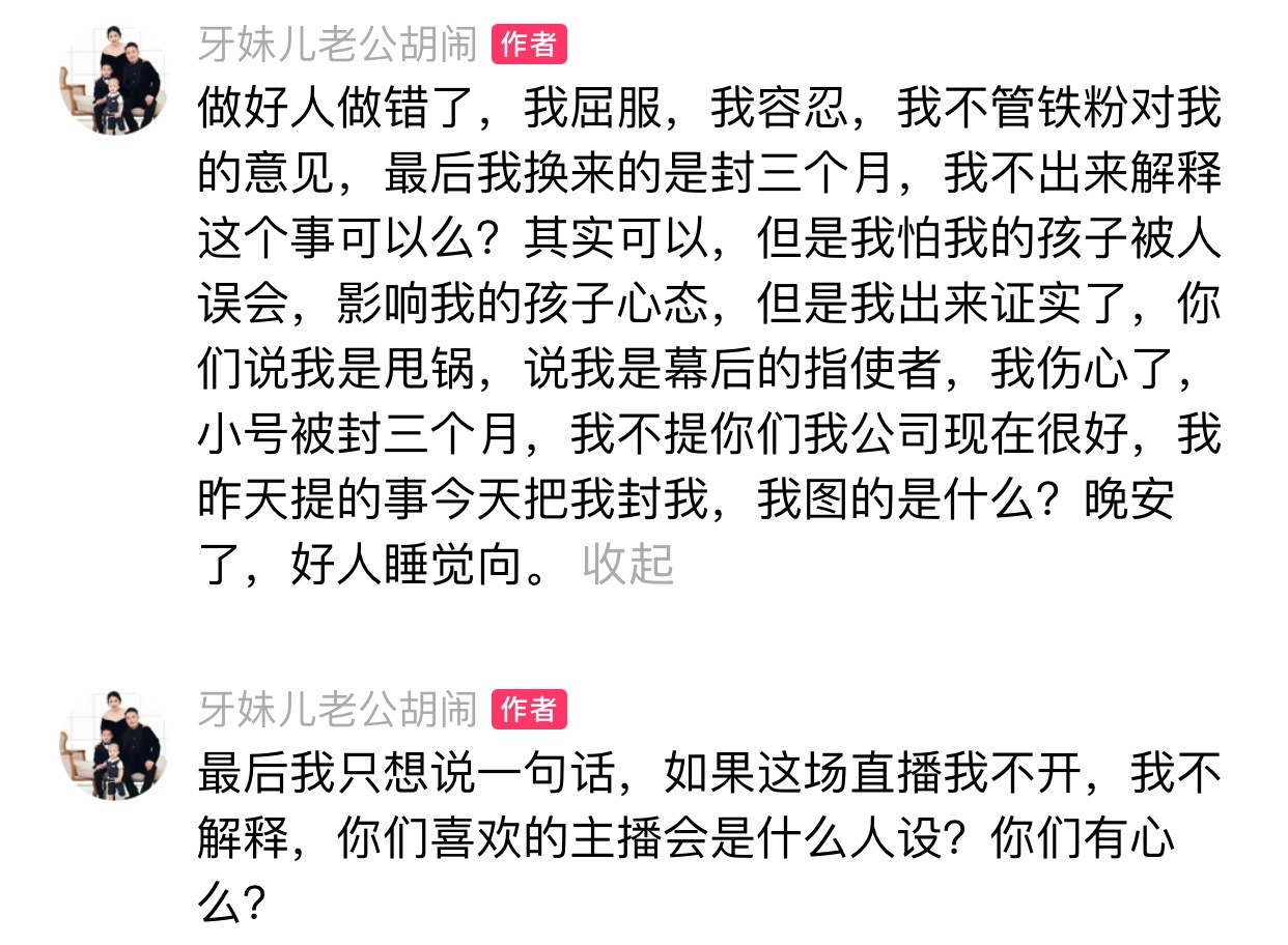 胡闹小号疑因回应泼汽油事件,提了菲妹被粉丝举报封三个月!(侵犯他人名誉权)做好人做错了,我屈服,我容忍,我不管铁粉对我的意见,最后我换来的是封三个月,我不出来解释这个事可以么?其实可以,但是我怕我的孩子被人误会,影响我的孩子心态,但是我出来证实了,你们说我是甩锅,说我是幕后的指使者,我伤心了,小号被封三个月,我不提你们我公司现在很好,我昨天提的事今天把我封我,我图的是什么?最后我只想说一句话,如果这场直播我不开,我不解释,你们喜欢的主播会是什么人设?你们有心么?