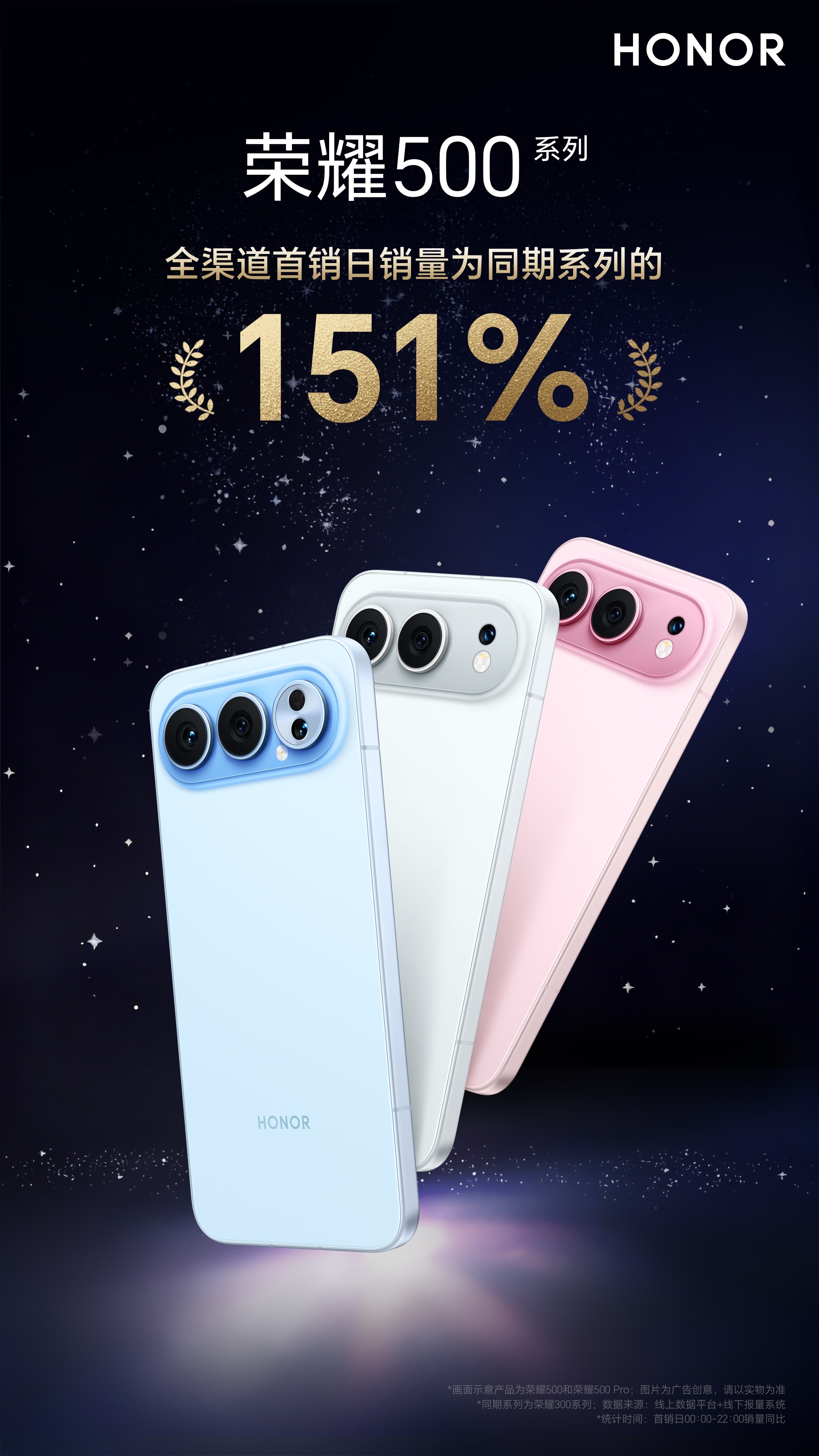 意料之中大卖了,荣耀500系列首日全渠道销量达到了同期系列的151%,目前综合产