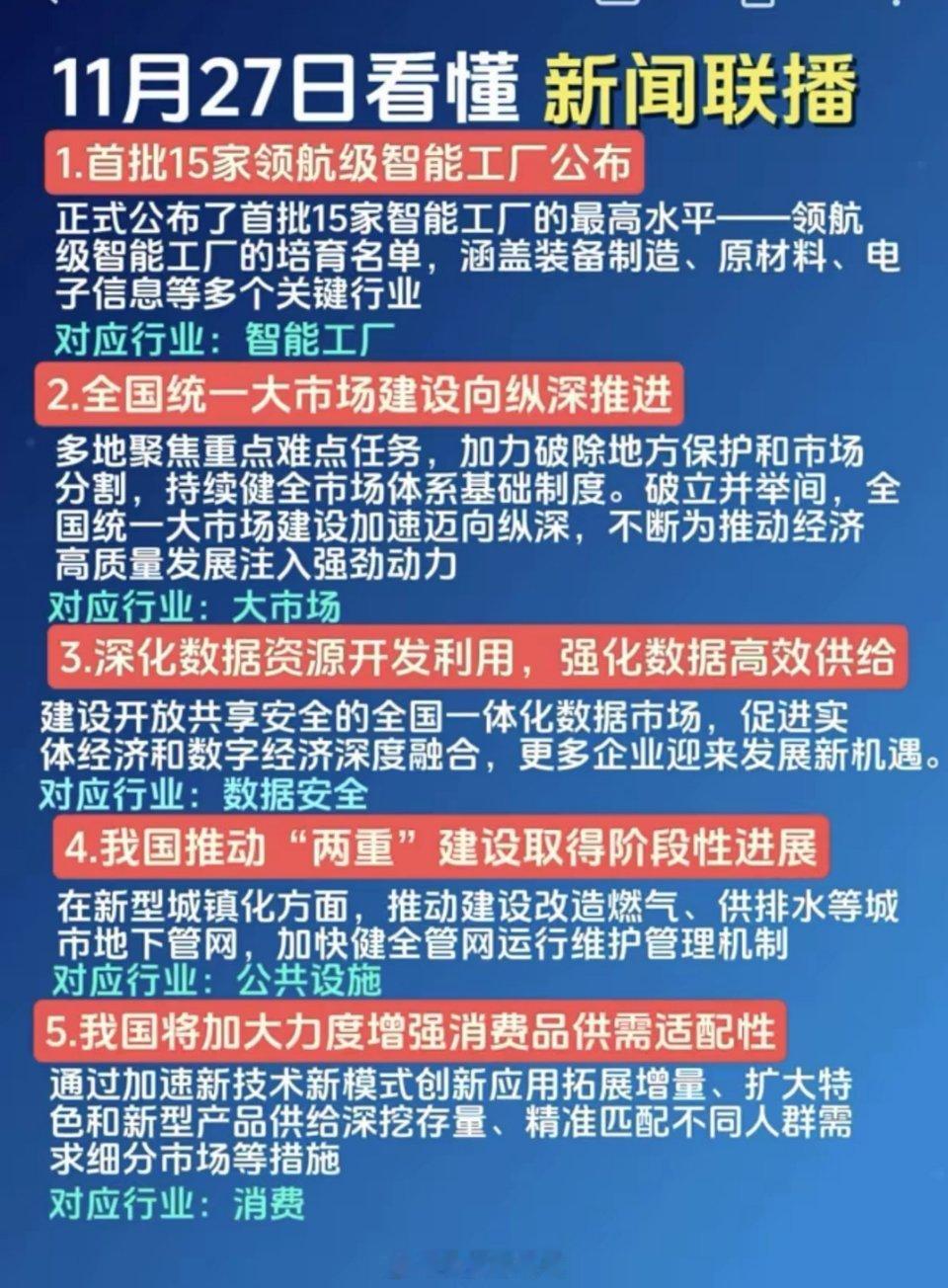 11.27周四 新闻联播里投资机会!1.智能工厂2.统一大市场3.数据安全4.公共设施(燃气,供排水)5.大消费