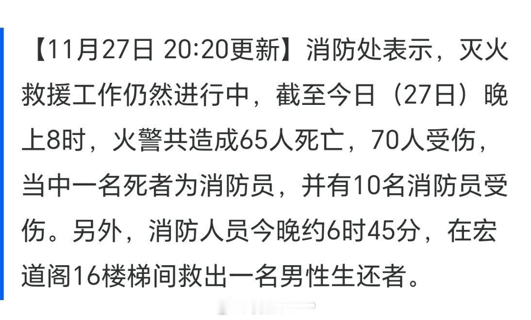 香港火灾已致65人遇难香港消防处表示,灭火救援工作仍然进行中,截至今日(27日)晚上8时,火警共造成65人死亡,70人受伤。