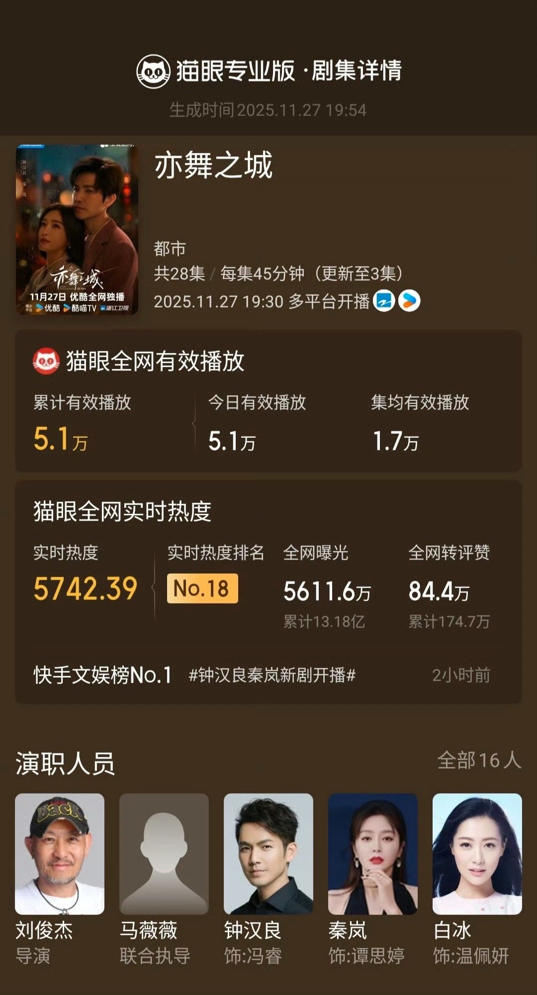 亦舞之城开播23分钟卫视收视登顶 谁还没看《亦舞之城》!钟汉良秦岚一出手就是王炸,开播23分钟卫视收视直接冲顶,猫眼专业版认证的爆款潜质,剧情又甜又有张力,不允许有人错过这波好剧!