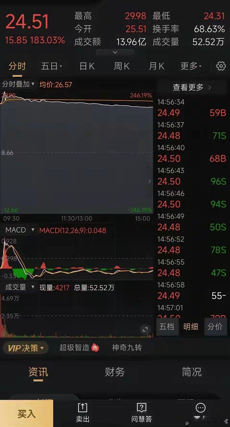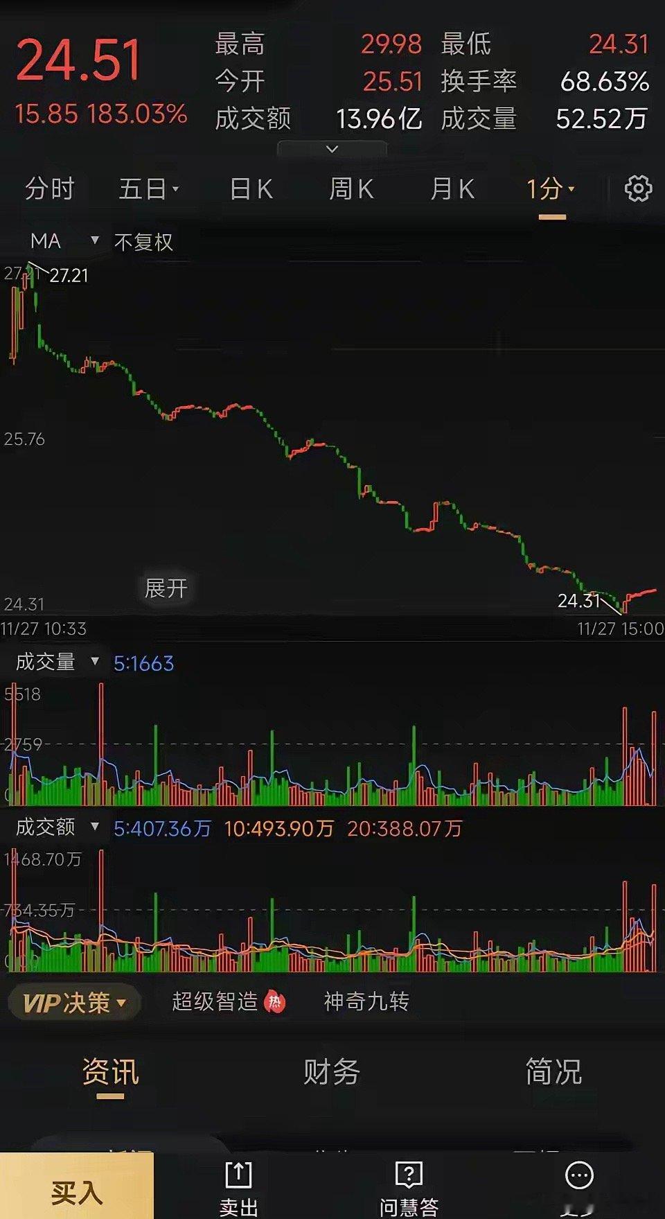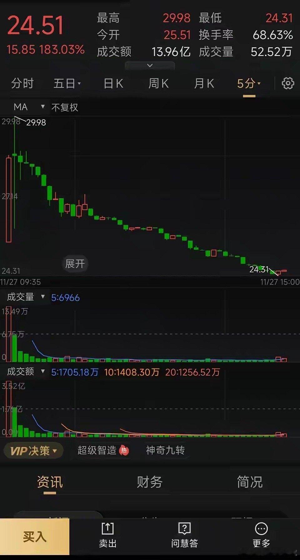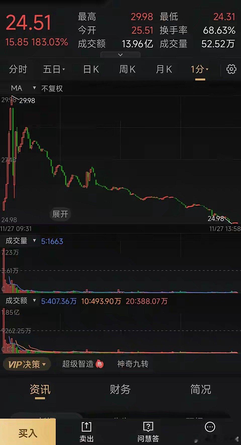 13.96亿元的成交额,其中被套的资金就超过了13亿元,这只新股一上市就开启套人模式!今天又有一只新股上市了,发行价8.66元的它集合竞价以25.51元开盘,上涨194.57%,开盘后前两分钟小幅上涨,9:32分时开始快速拉升,到了9:36分时涨到了今天的最高价29.98元,这七分钟的时间累计成交了4.42亿元,占到了全天成交额的31.66%。9:37分股价快速回落到26.86元,随后的2分钟又快速反弹到28.58元,到了9:49分时股价开始缓慢回落,并且在下午14:50分时跌到全天最低点24.31元,收盘时回升到24.51元,全天的成交额接近14亿元,换手率只有68.63%。今天进去的13.96亿元资金中,股价在26元以上成交的资金就超过8亿元,在25元~26元成交的也有4.6亿元左右,在24.51元~25元之间成交的资金有4738万元,在收盘价24.51元以下成交的仅有7760万元,也就是说只有这7760万元在今天收盘时没有被套住,那些在29元以上进去的资金目前亏损超过了18%。不知道大家对于这只新股刚上市就出现长长的上影阴线有什么个人看法?欢迎在评论区交流讨论一下!