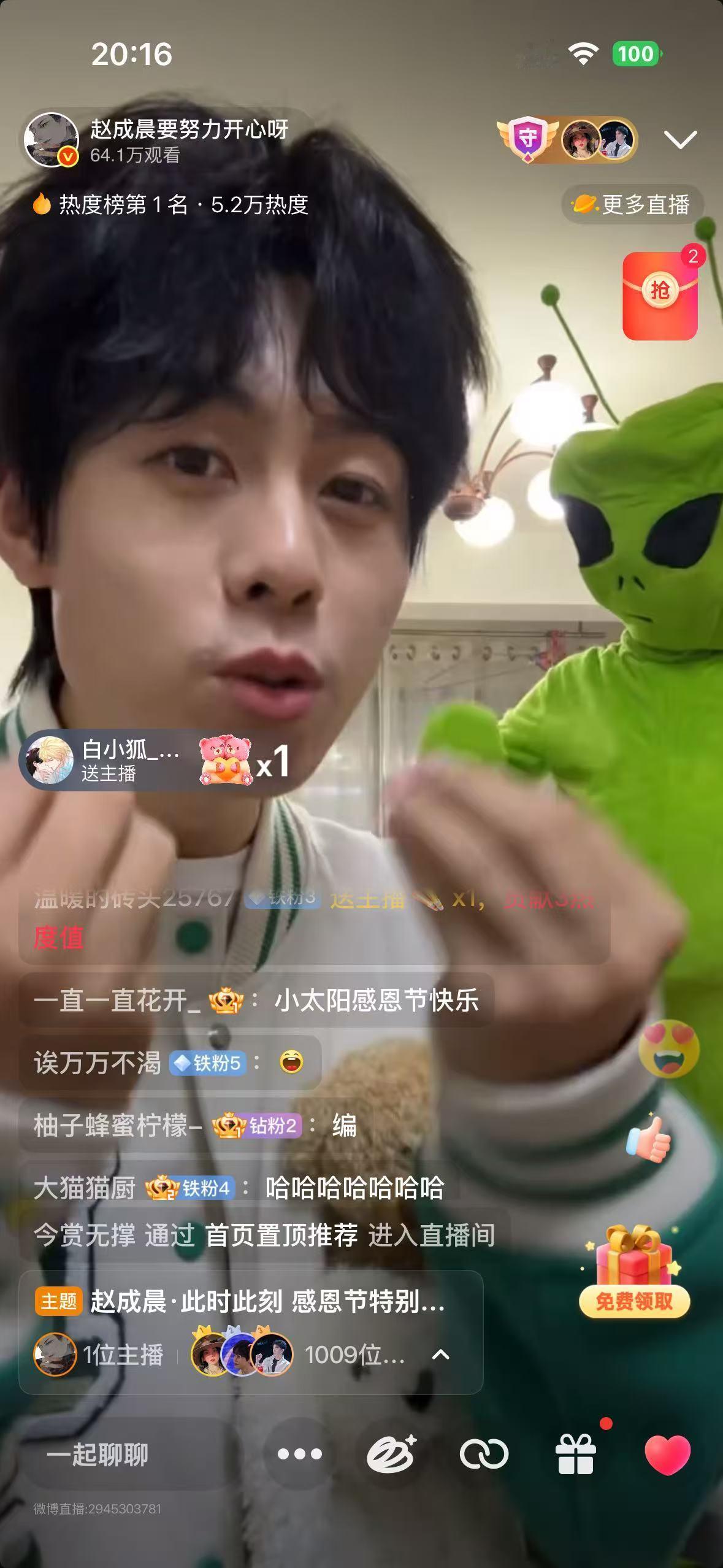 动漫赵成晨直播间有外星人赵成晨感恩节直播赵成晨这直播间嘉宾真的是够份量 ,竟然是绿油油的外星人!