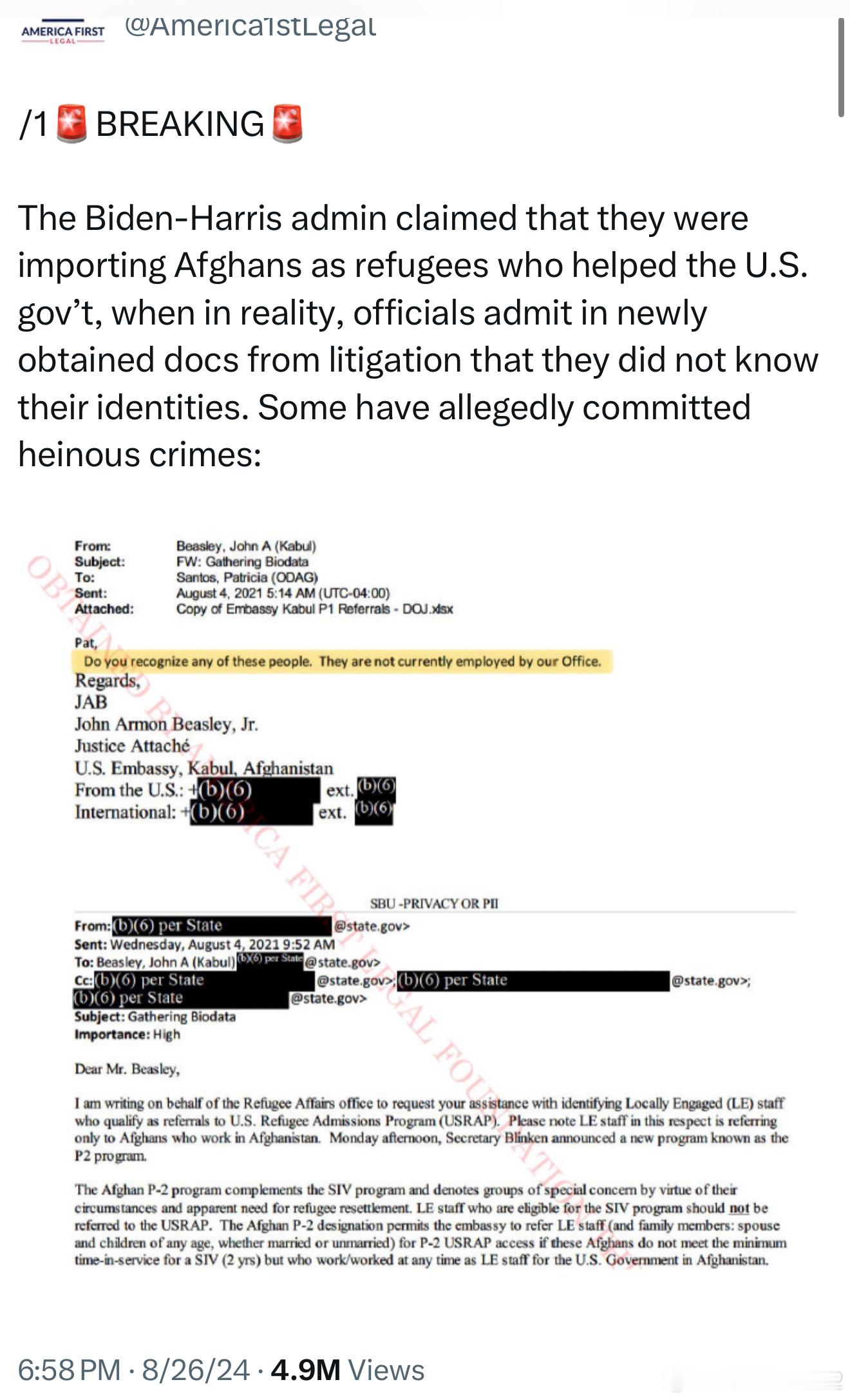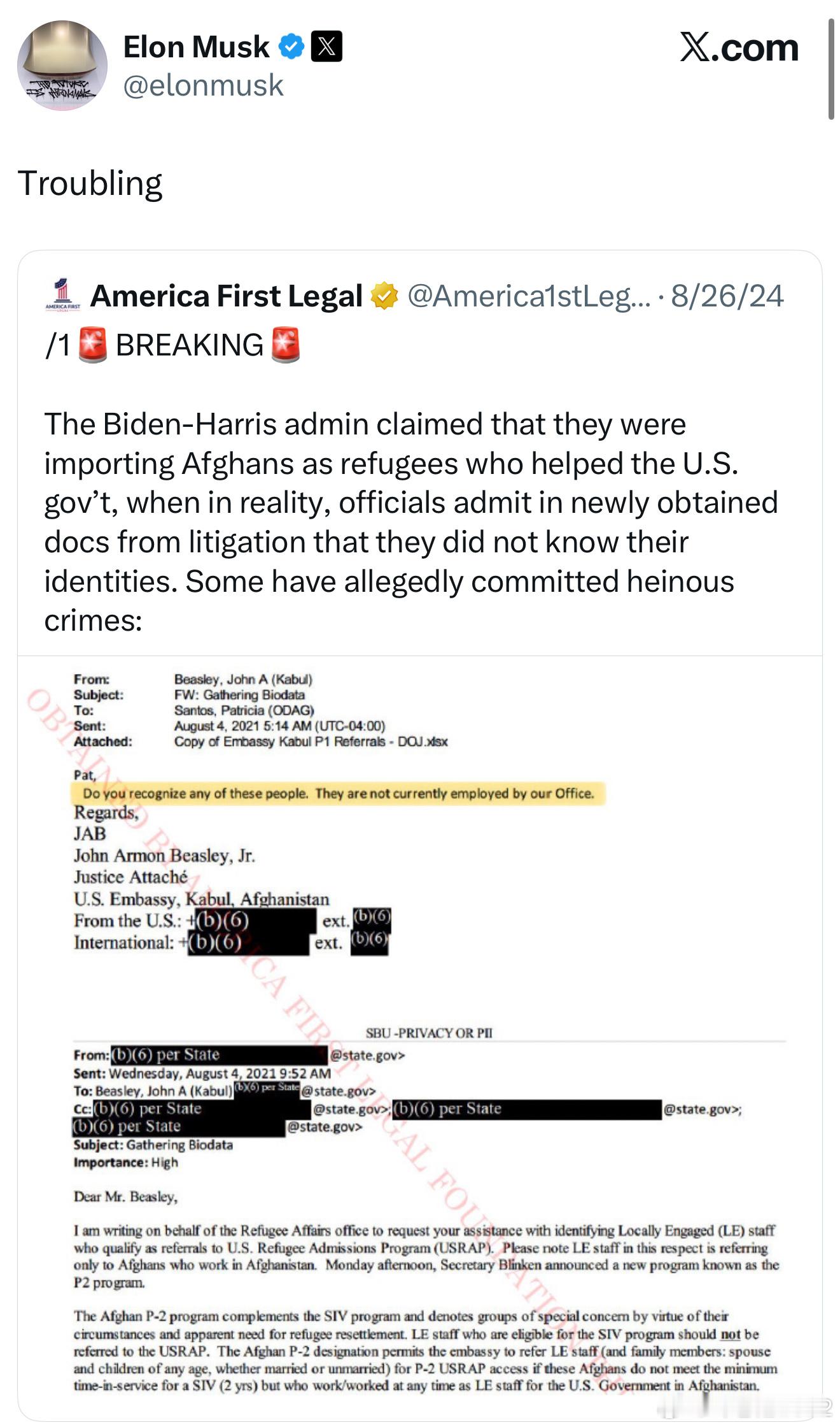 马斯克的转发。拜登-哈里斯政府声称,他们引进阿富汗人作为难民,这些人帮助了美国政府。然而,根据新近获得的诉讼文件,官员们承认他们并不知道这些人的身份。据称,其中一些人犯下了令人发指的罪行。