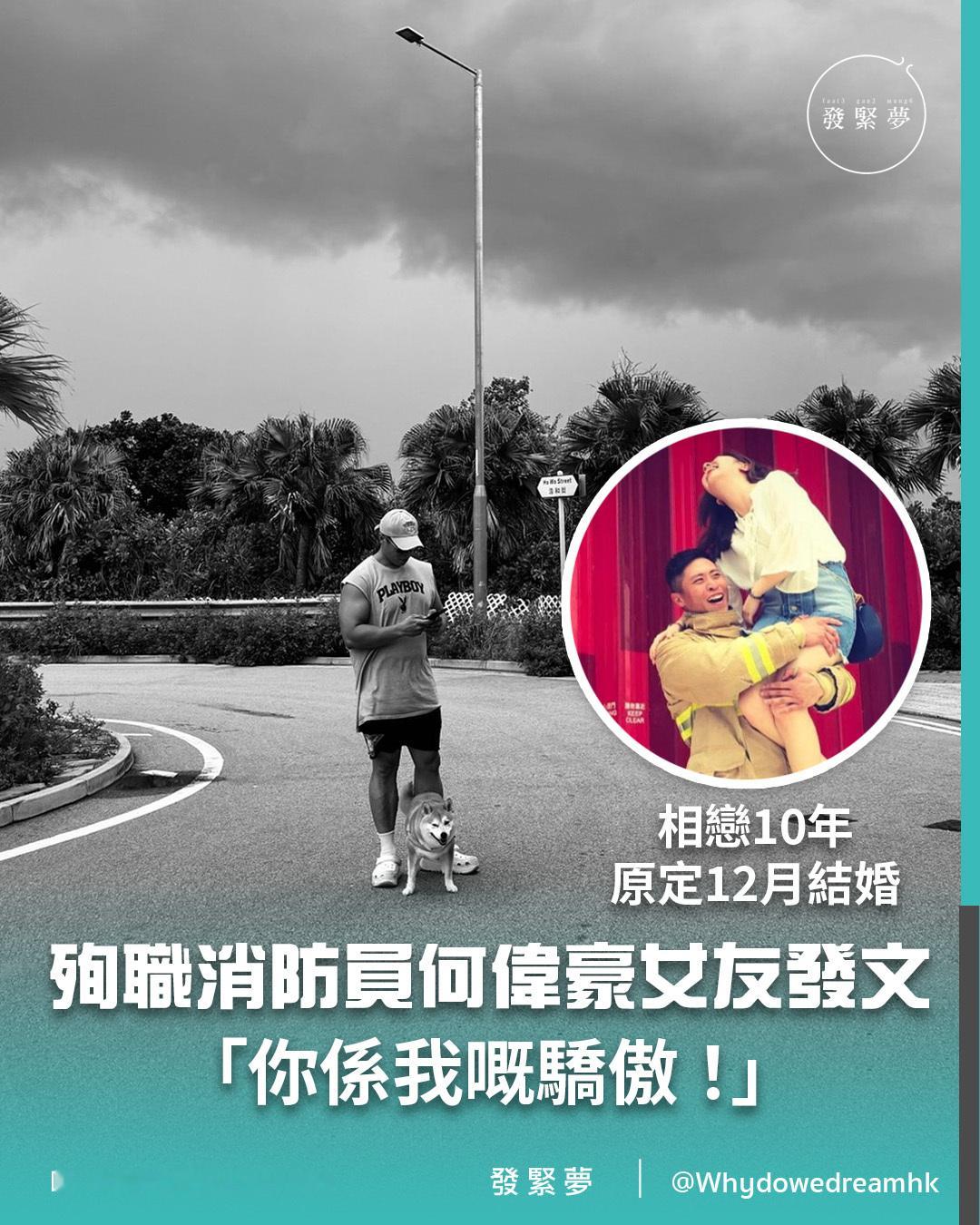 大埔宏福苑火灾至今已造成55人死亡,其中包括消防员何伟豪殉职。何伟豪与女友相恋 10 年,他十分疼爱女友,IG 上全是与女友的合照。有消息称,两人原本计划下个月结婚,可惜天意弄人……悲剧发生后,他的女友今日在 IG 上传了一张何伟豪的黑白单人照,这是她首次发文倾诉心声:“我的超级英雄任务完成,返回氪星啦~你是我的骄傲!” 但未婚夫突然离世,她难掩悲痛:“对不起,我想向大家请个小假期,因为…… 我真的接受不了。我真的好想好想再牵住你的手……”