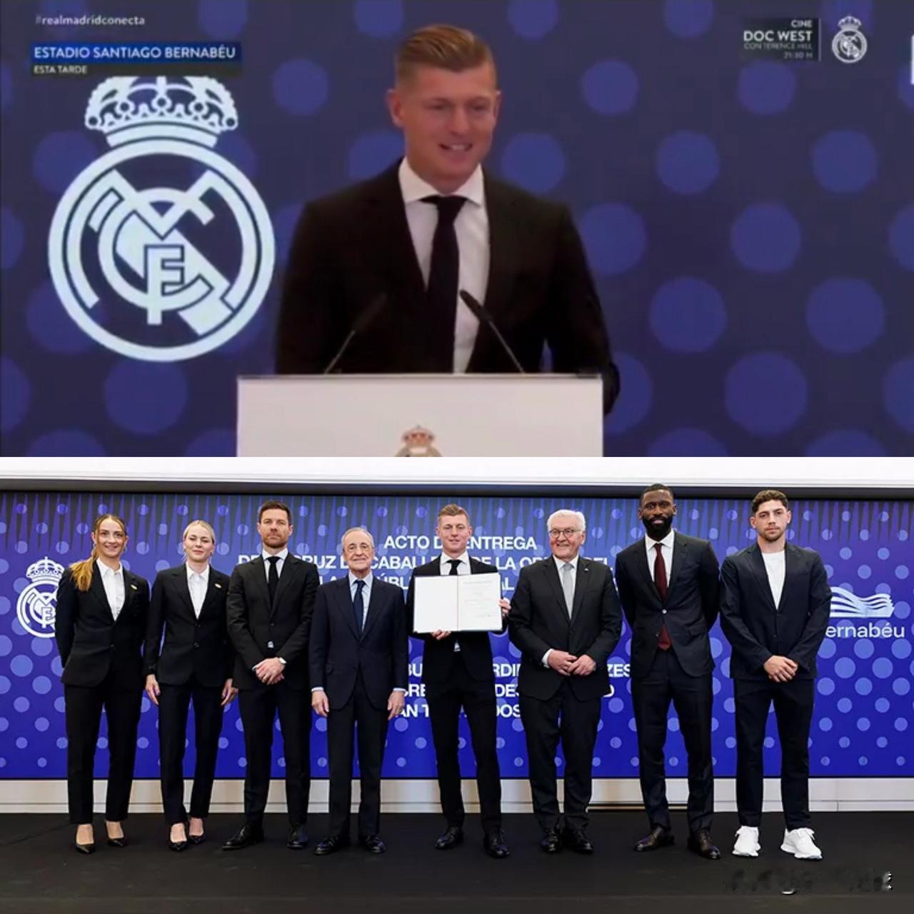 托尼·克罗斯:“我知道弗洛伦蒂诺和德国总统会到场,但我不知道我的前队友们也会来。就连我的好朋友安东尼奥(吕迪格)也没告诉我。这真是个惊喜,能拥有这么好的队友和这么好的人,我感到非常高兴。” “当他们告诉我授勋仪式将在伯纳乌球场举行时,我非常高兴,因为那里似乎是接受勋章的完美场所。十年来,这里一直是我的家,而且我觉得它永远都会是我的家。我一直都很喜欢这座球场。” 2025年11月28日,克罗斯重返伯纳乌球场,接受德国联邦共和国功绩勋章骑士十字勋章,巴尔韦德、吕迪格、哈维·阿隆索等皇马名宿出席见证。 现场,克罗斯造型获赞“天生衣架子”,正装造型引发球迷讨论。