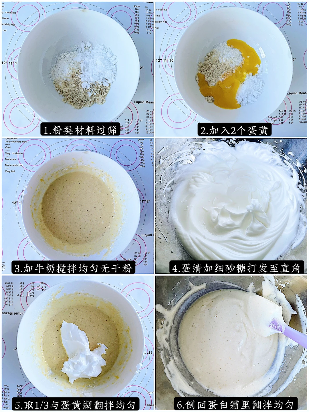 2️⃣蛋清分3次加入细砂糖打发至硬性发泡的状态,取1/3的蛋白霜与蛋黄糊翻拌均匀以后,倒回剩下的蛋白霜里,翻拌均匀。