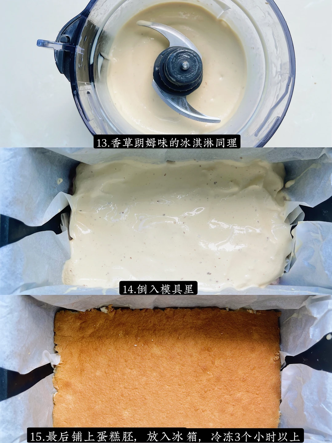 5️⃣香草朗姆冰淇淋稍微解冻一下,放入榨汁机同样搅打顺滑,倒入模具里