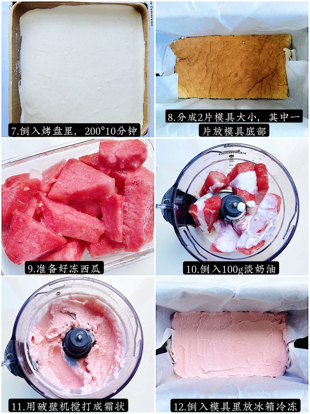 4️⃣西瓜去皮设成快,提前放入冰箱冷冻一夜,与淡奶油一起放入破壁机搅打成冰沙,倒入模具里冷冻30分钟