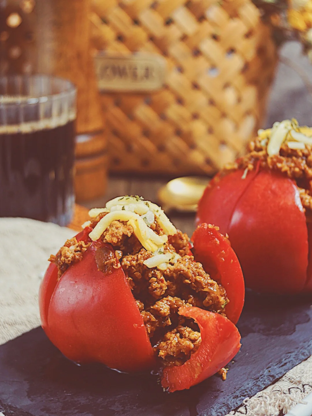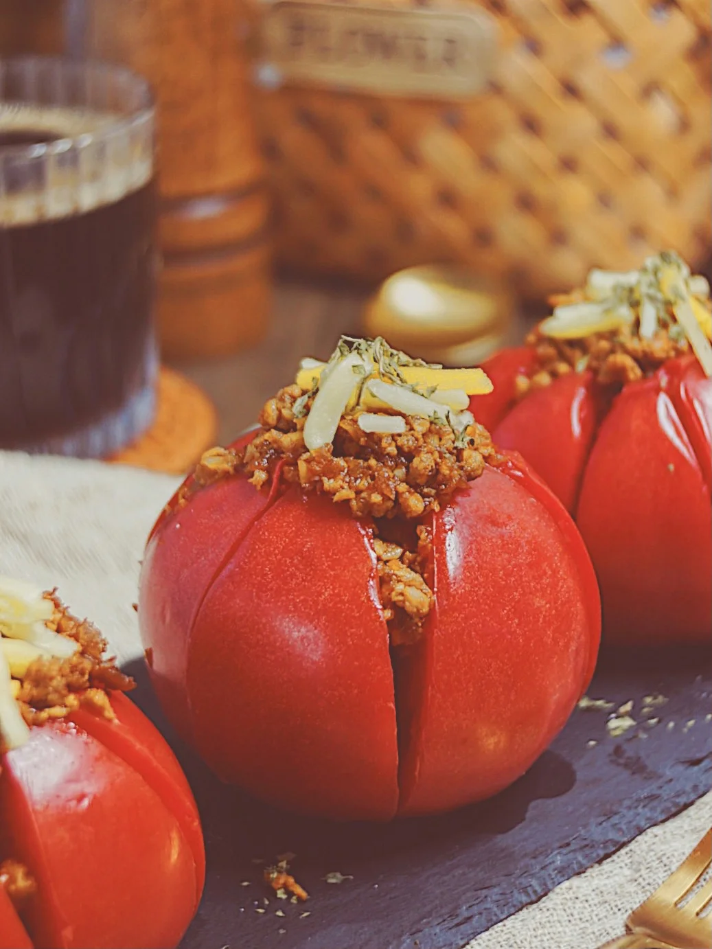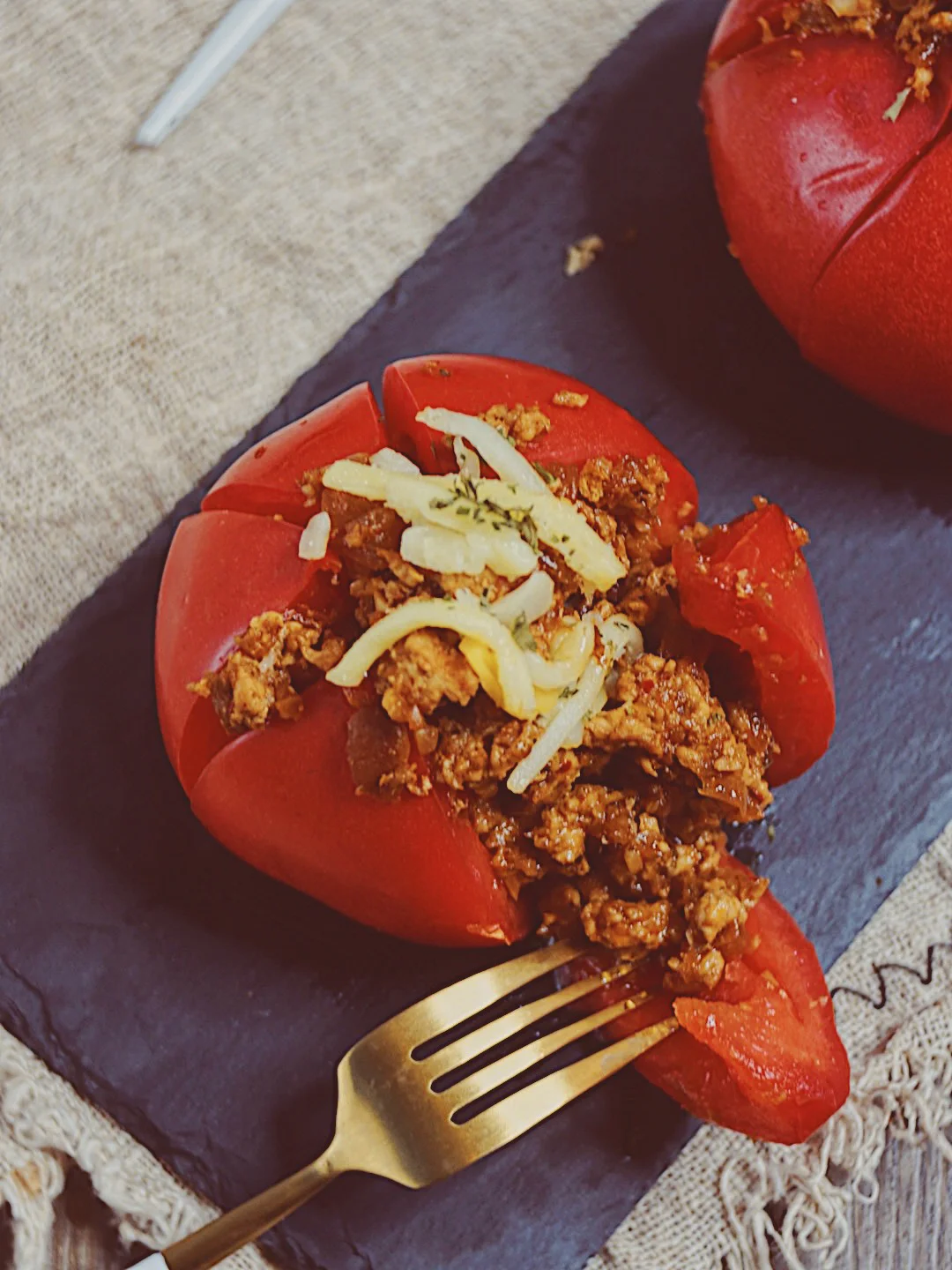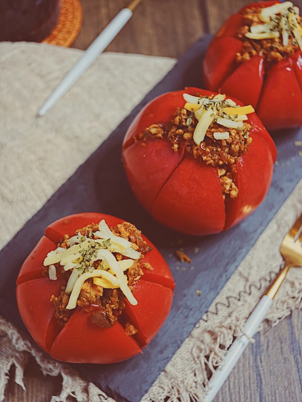 4️⃣炒好的肉酱填入番茄里,顶部撒上马苏里拉芝士和一小撮欧芹碎