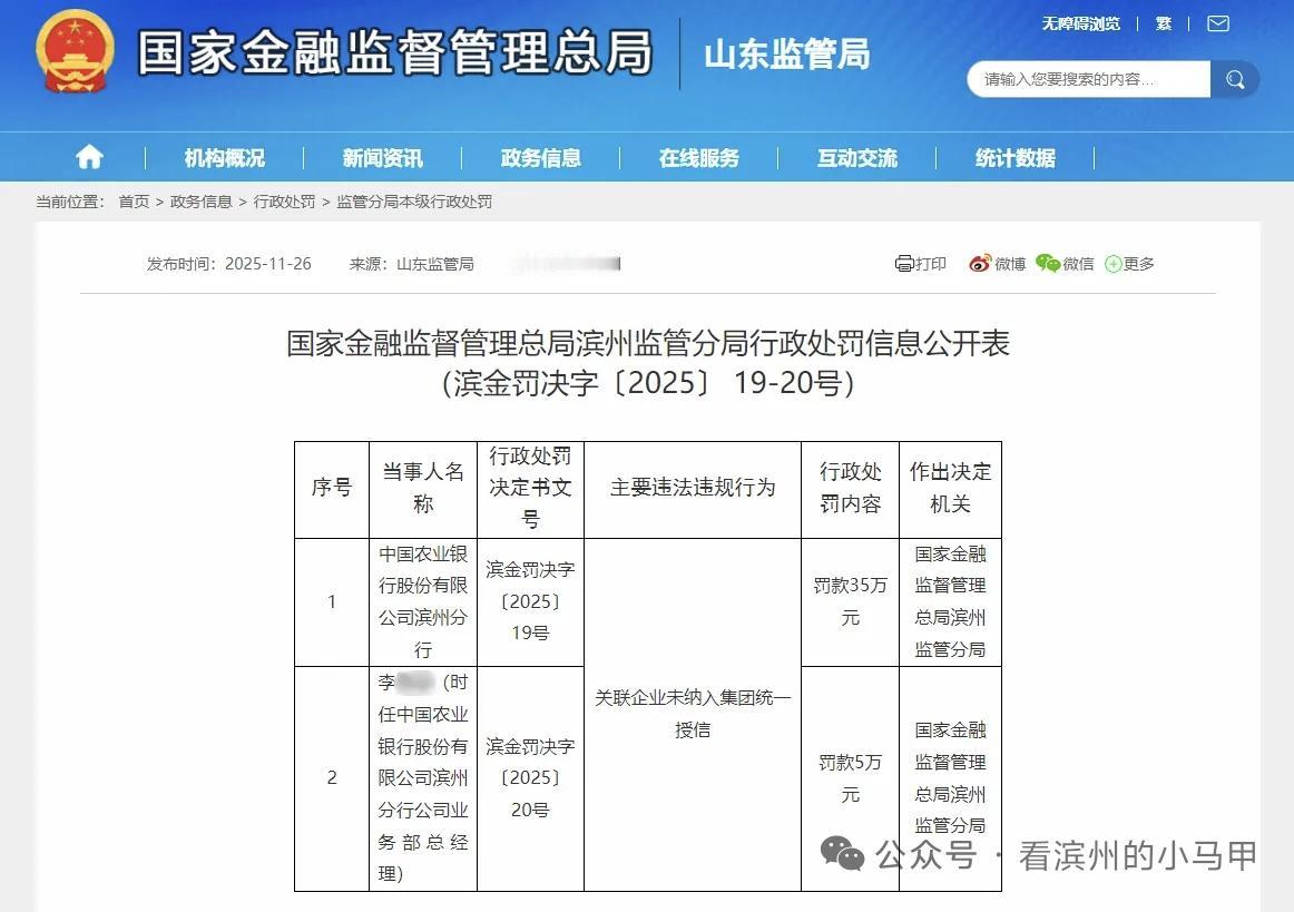 农行滨州分行,被罚35万 近日,国家金融监督管理总局山东滨州监管分局发布了罚单,剑指中国农业银行股份有限公司滨州分行及其相关责任人。 罚单显示,中国农业银行股份有限公司滨州分行的主要违法违规事实为:关联企业未纳入集团统一授信。 针对这一行为,国家金融监督管理总局滨州监管分局对其处以35万元罚款。此外,李某某时任中国农业银行股份有限公司滨州分行公司业务部总经理,被处以5万元罚款。