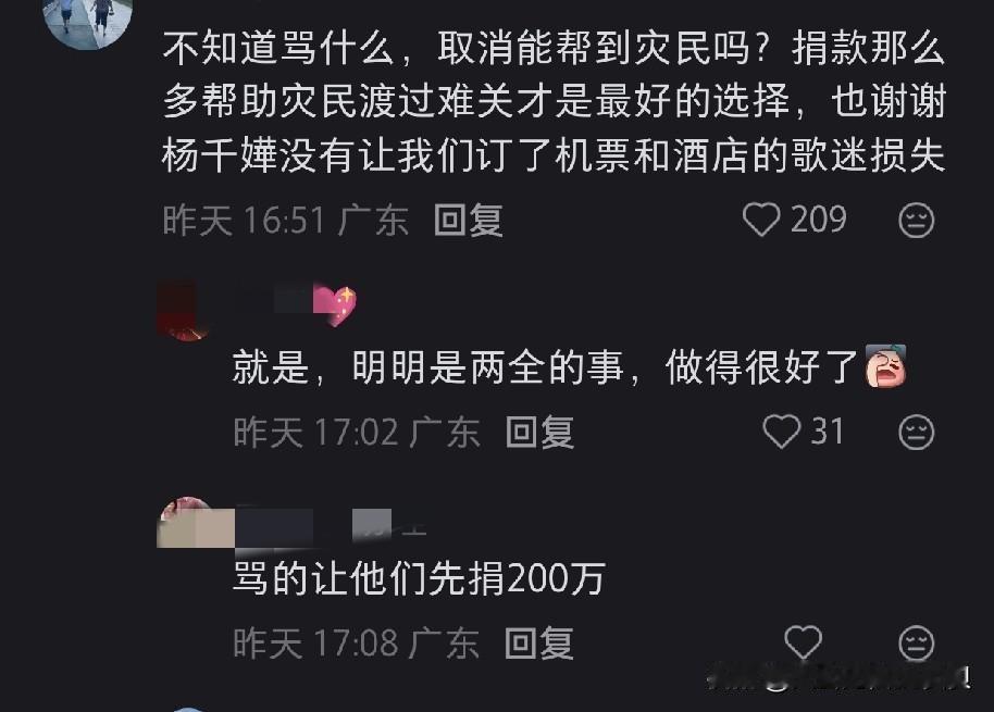杨千嬅29号的演唱会如期举行,有些网友又开始挑刺了。 说她这个行为太冷漠,别的艺人都取消活动了,为什么她不能取消! 别人取消的是一天的活动,虽然也有损失,但还能接受。 杨千嬅这个是六场连开,前期已经投入了很多。 场馆租赁费,演唱会几百工作人员的心血,还有全世界粉丝的食宿机票门票费,这些加起来🉐钱太多了。 取消的话损失巨大!不知道骂她的网友能承担吗? 而且她把第一场的收益,以及六场的周边收益,全部捐出用于灾后重建,这个不少钱呢。 所以,真的没必要骂她了。谁也不愿意看到这样的悲剧。 杨千嬅