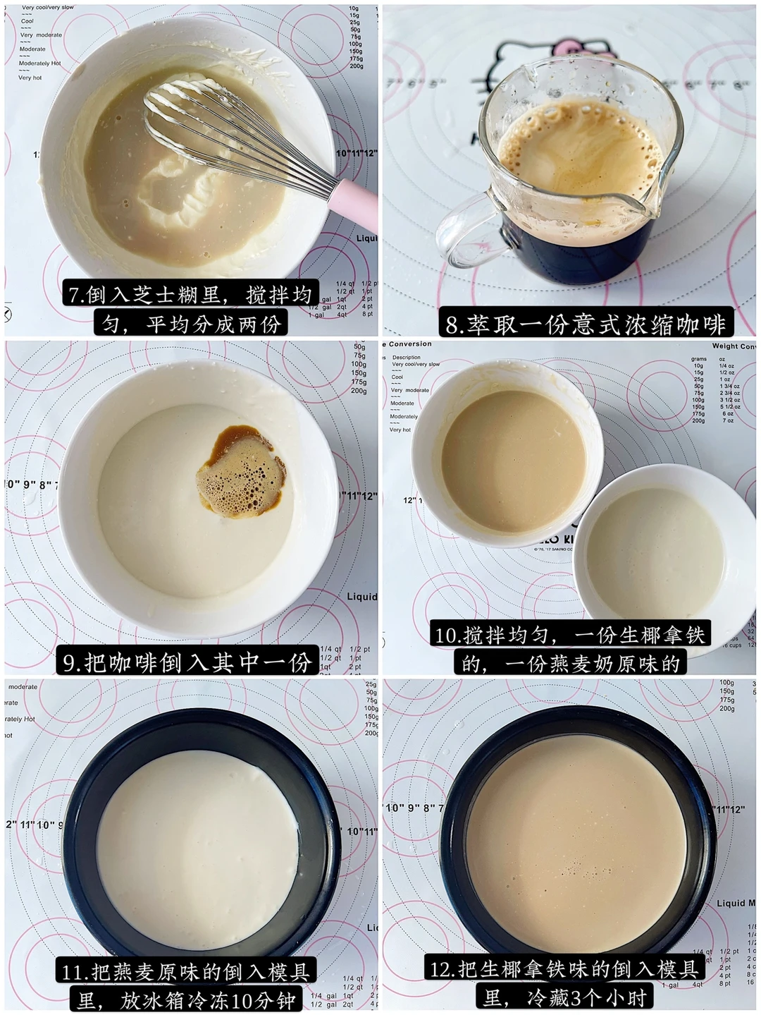 5️⃣白色的奶油芝士糊倒入模具里,冰箱冷冻20分钟以后,倒入咖啡色的拿铁芝士糊,放入冰箱冷藏3个小时。