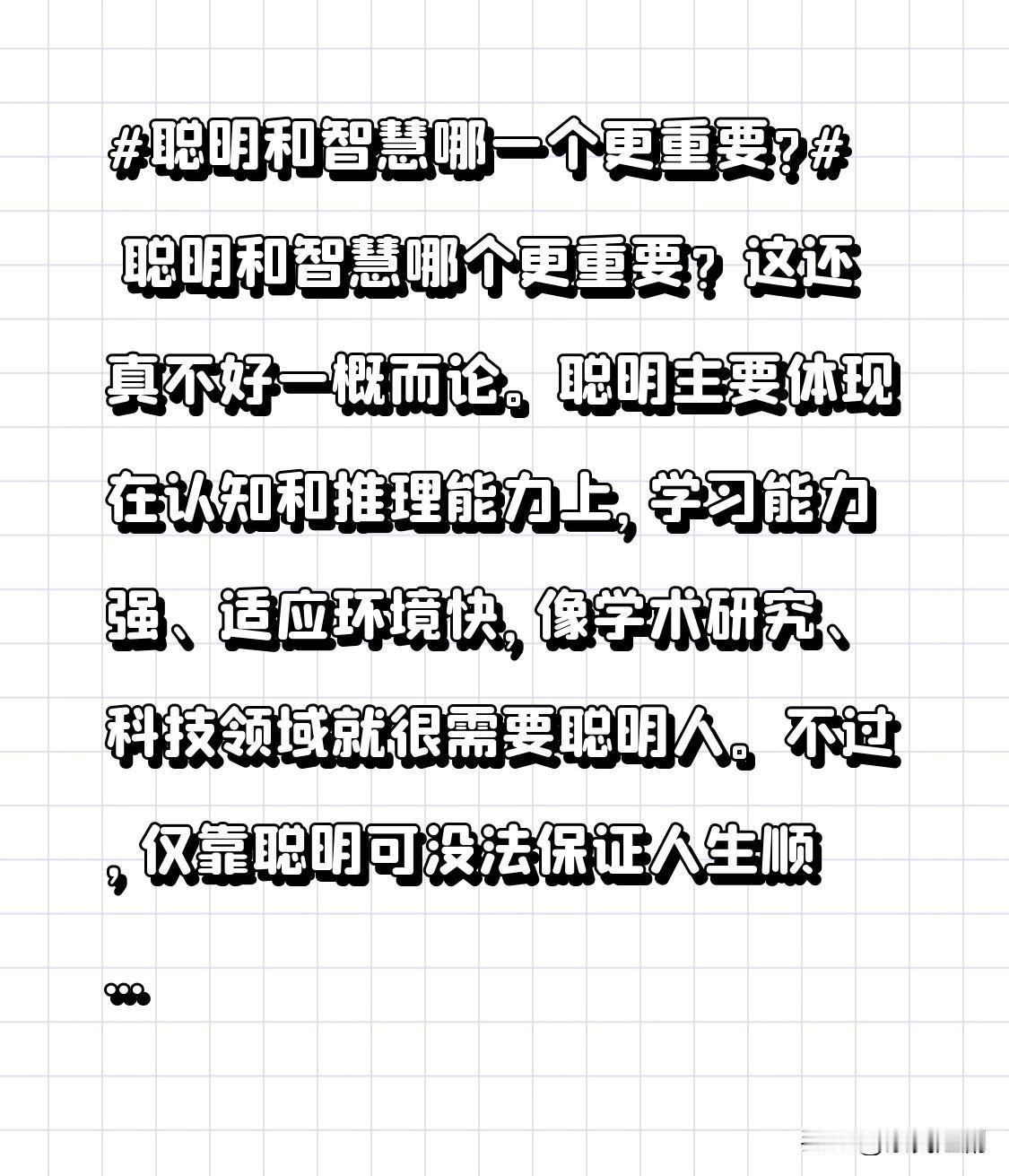 聪明和智慧哪一个更重要? 聪明和智慧哪一个更重要? 聪明和智慧哪个更为重要?这着实难以一概而论。聪明主要体现于认知与推理能力,学习能力出众、适应环境迅速,诸如学术研究、科技领域便十分需要聪明人。然而,仅仅依靠聪明并不能确保人生一帆风顺。 智慧则有所不同,它包含对生活经验的理解、道德判断等多个方面。一个富有智慧的人,能够灵活运用知识和经验解决问题,做出明智的决策。即便智商并非顶尖,也能够应对生活中的种种挑战。 从长远角度来看,智慧似乎更为关键。随着年龄的增长和经验的积累,智慧能够让我们更好地实现自我成长,促进社会和谐。所以,聪明是基础,智慧才是运用基础的高级策略。