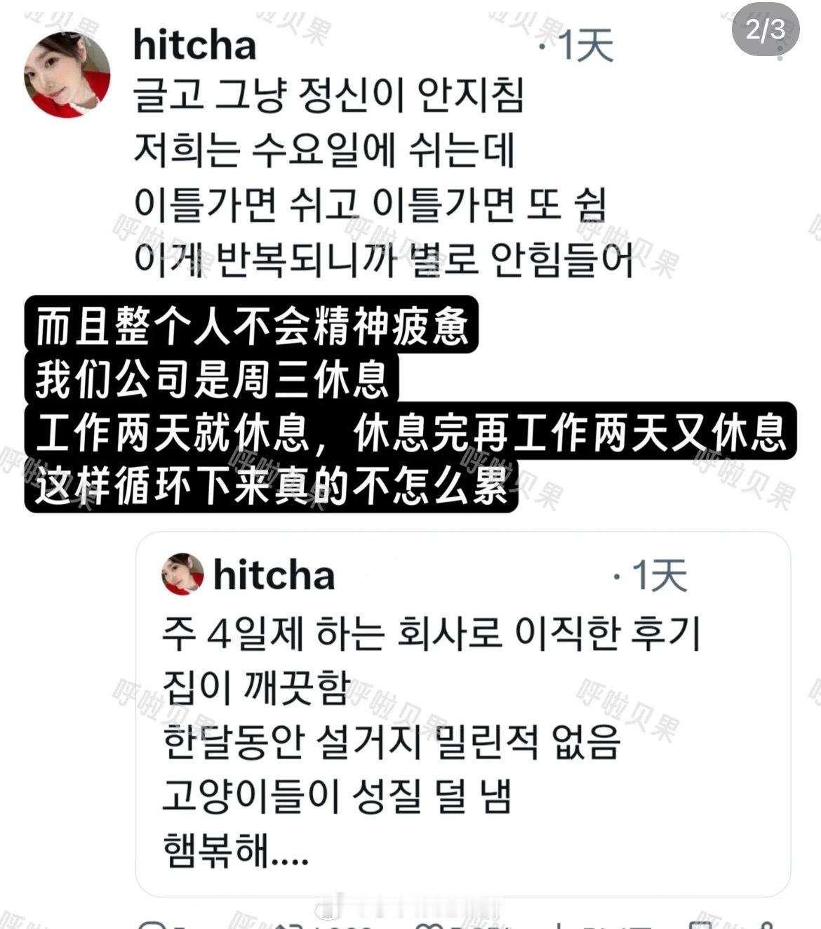 热议/跳槽到每周工作四天的公司后...韩网友分享了她跳槽到每周四日工作制的公司后的体验。🤔大家有体验过做四休三的工作制吗?