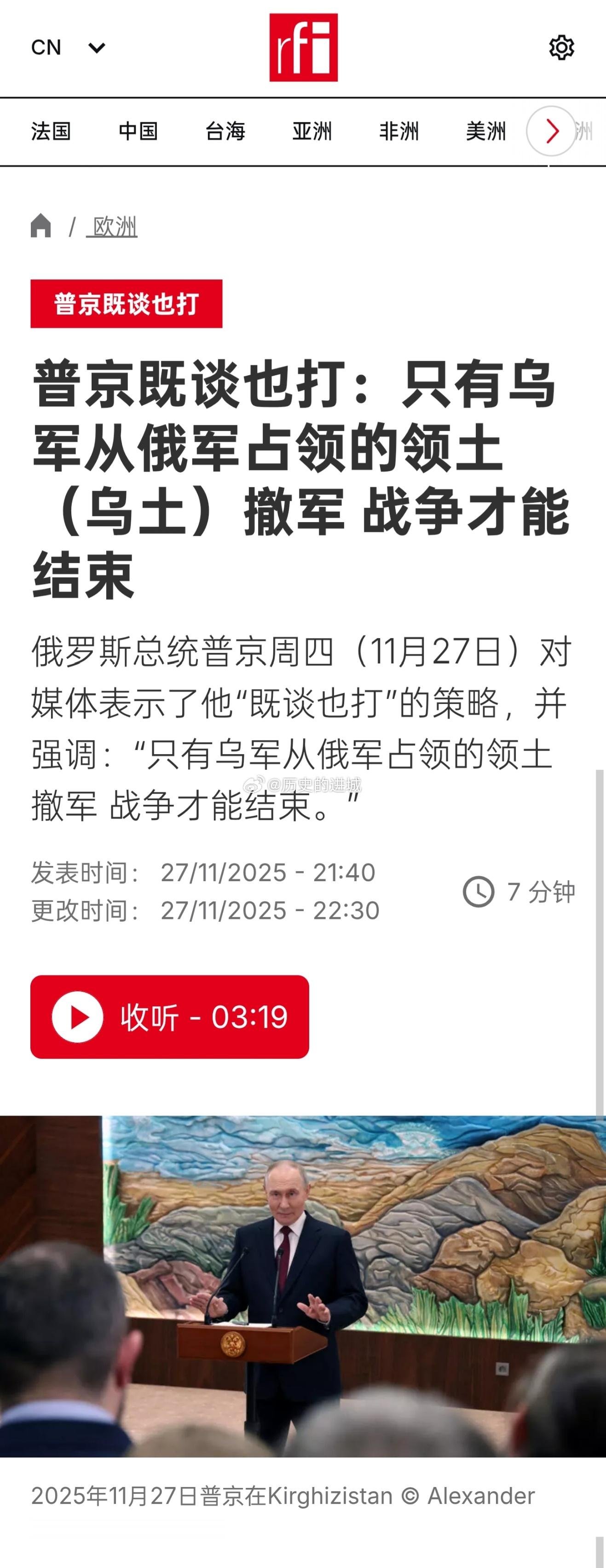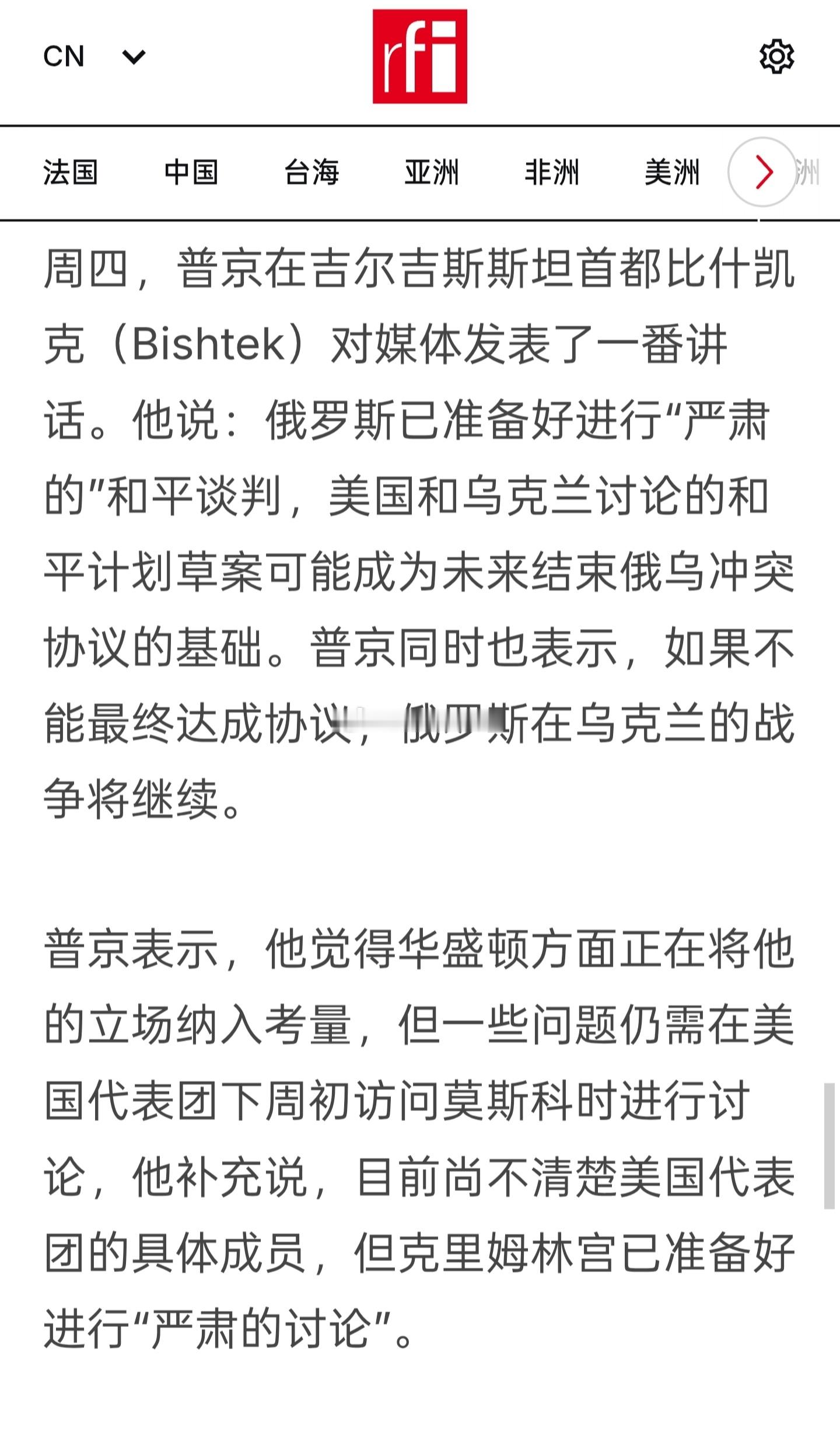 俄罗斯总统普京周四(11月27日)对媒体表示了他“既谈也打”的策略,并强调:“只有乌军从俄军占领的领土撤军 战争才能结束”。他说:俄罗斯已准备好进行“严肃的”和平谈判,美国和乌克兰讨论的和平计划草案可能成为未来结束俄乌冲突协议的基础。普京同时也表示,如果不能最终达成协议,俄罗斯在乌克兰的战争将继续。普京表示,他觉得华盛顿方面正在将他的立场纳入考量,但一些问题仍需在美国代表团下周初访问莫斯科时进行讨论,他补充说,目前尚不清楚美国代表团的具体成员,但克里姆林宫已准备好进行“严肃的讨论”。