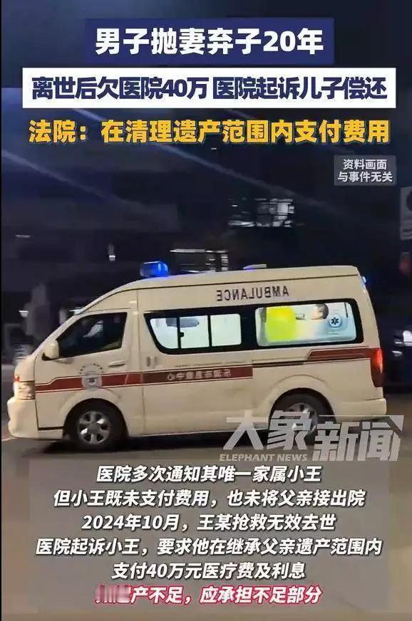 男子抛妻弃子20年,儿子拒还其40万医药费,“父债子偿”的老黄历早该撕掉了! 王大爷躺在病床上,望着手机里儿子发来的“断绝关系”短信,浑浊的眼睛里滚出泪水。20年前,他揣着家里仅有的积蓄,跟着邻村女人远走他乡,留下妻子和刚上小学的儿子相依为命;20年后,他突发脑溢血昏迷,手术费加后续治疗需要40万,走投无路的他只能联系儿子,却等来一句冰冷的“我没有你这样的父亲”。 有人说“血浓于水”,可这20年的空白,哪是一句“父子”就能填补的?王大爷的儿子小宇记得,小时候冬天没有暖气,母亲抱着他缩在被窝里,用体温给他取暖;记得母亲每天打三份工,手指被冻得开裂,却从舍不得给自己买一副手套;记得同学嘲笑他“没爹的孩子”,他躲在墙角哭,母亲红着眼眶告诉他“你还有我”。而王大爷,只在他18岁生日时,寄过一张没有署名的银行卡,里面的2000块钱,被小宇原封不动地退了回去——他要的从来不是钱,是一个父亲的陪伴,可这个简单的愿望,终究成了奢望。 “父债子偿”的前提,是父亲尽到了为人父的责任。王大爷在儿子最需要陪伴、最需要支撑的时候选择逃避,把所有的重担都压在一个女人身上,如今自己老了、病了,却想让儿子“尽孝”,这不是道德绑架是什么?小宇拒绝的不是40万医药费,是那个从未尽过父亲义务的男人,是那段充满委屈和辛酸的童年。 现实中,总有一些人把“孝道”当成枷锁,把“血缘”当成理所当然的索取。可他们忘了,亲情是相互的,付出和回报从来都是对等的。父亲给儿子的,不该只是生命,还有陪伴、关爱和责任;儿子对父亲的孝,也不该是盲目服从,而是建立在尊重和感恩基础上的自愿。 你觉得小宇的做法对吗?如果是你,面对抛妻弃子20年的父亲,你会选择原谅吗?欢迎在评论区留下你的看法~热点话题