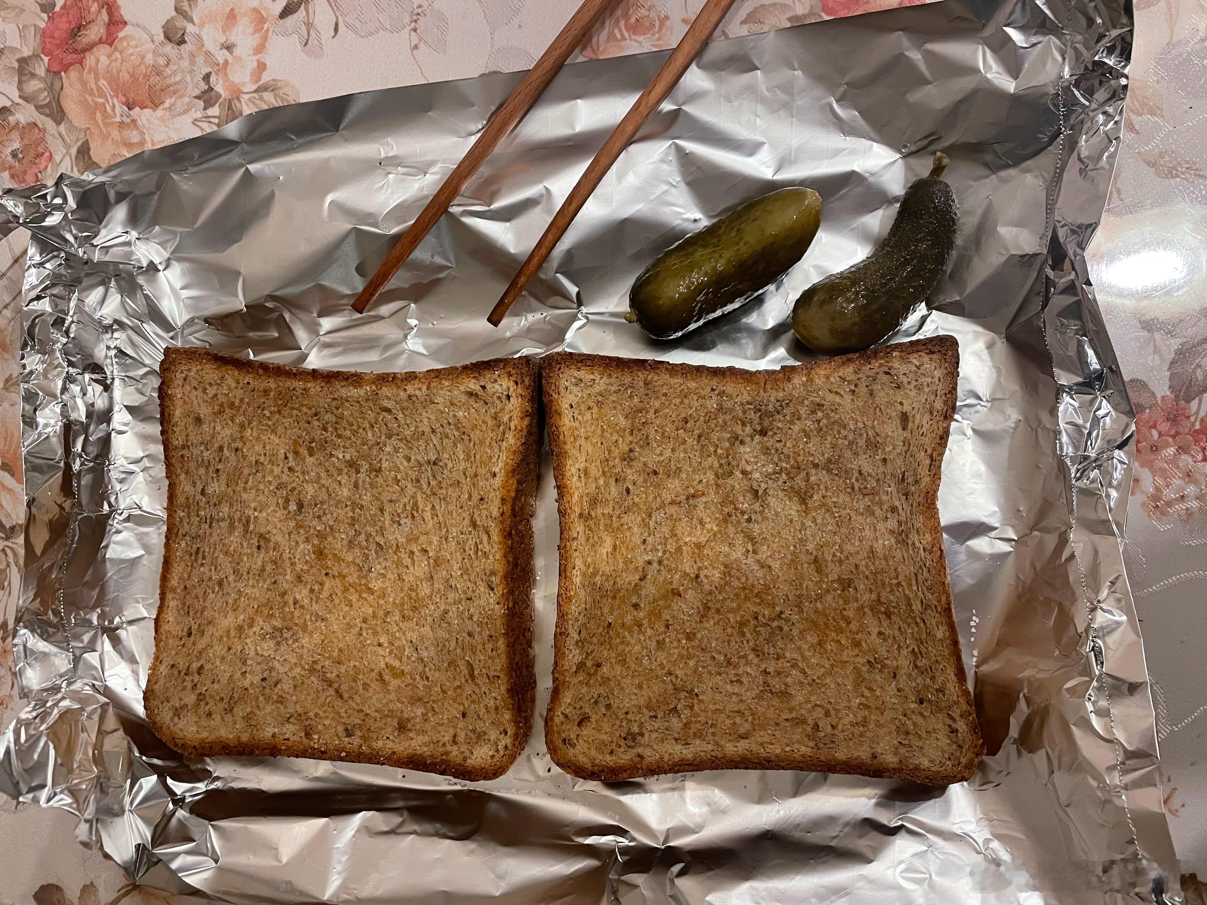 正宗中国人早餐全麦面包,上涂美国进口转基因大豆豆油、无碘盐两根德国酸黄瓜中国人,也可以吃健康、卫生的早餐