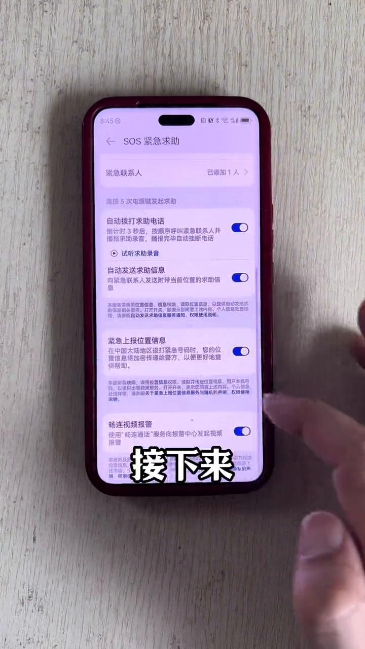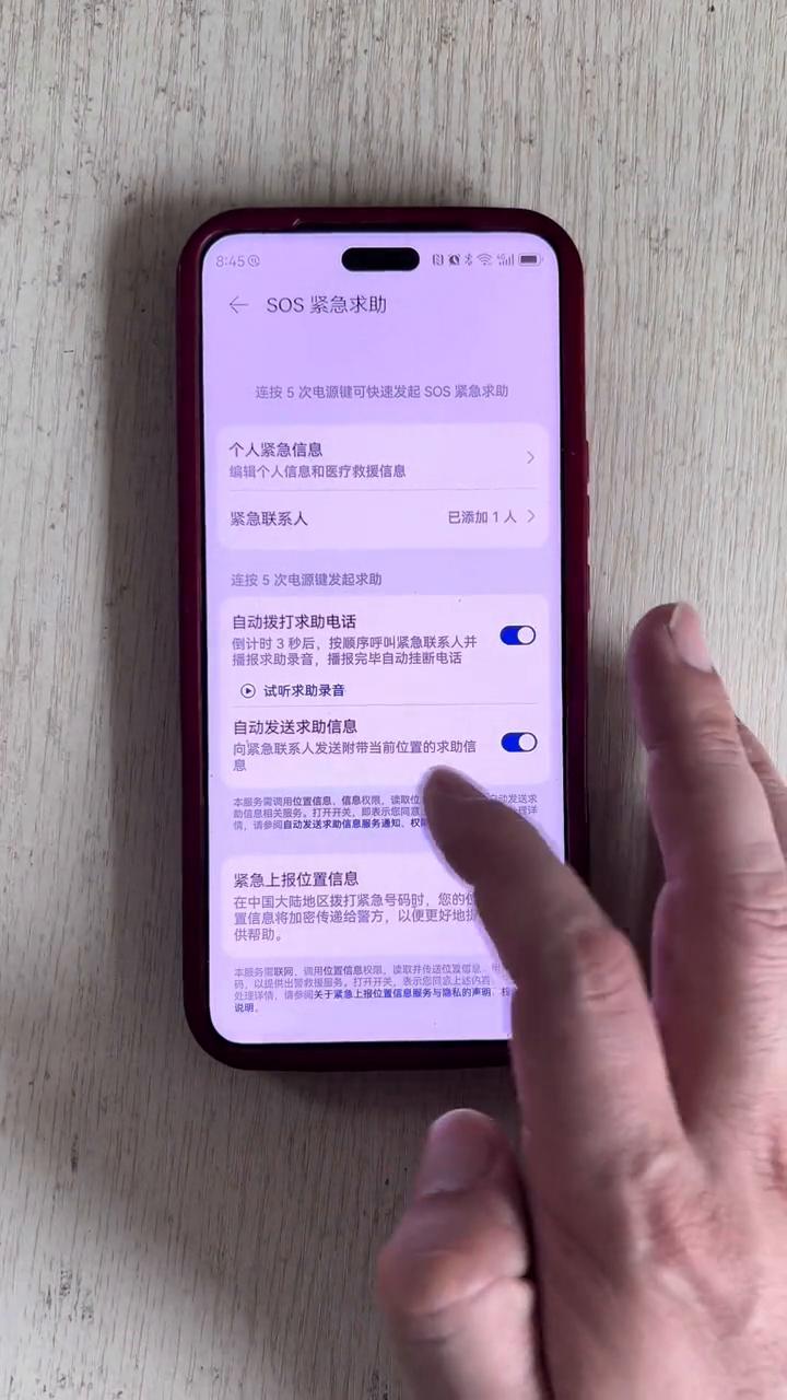 手机的保命功能你一定要知道。 手机的保命功能一定要知道。当你遇到抢劫行凶的危险的时候,要知道手机有这么一个功能,你可以在不拿出手机通话的前提下,只要摸到手机的电源键连续按5次,就会出现一个自动报警电话,并且会发送你所在的位置,不用你说话,警察也会赶过来。 这个功能是如何开启的?这条视频大家一定要保存和转发,关键的时候能救你一命。接下来我给大家操作一遍具体的开启流程,认真看。 ·第一步,把自己的手机拿出来,我这部手机是华为的nova12,安卓手机的大致操作方法都一样,不管你是哪个品牌,你跟着视频来操作一下。 →首先在手机上找到设置,点开它之后上方有一个搜索框,然后搜索SOS,SOS搜索出来之后就出现一个紧急安全求助,点进去。 →如果说你搜不出来的朋友们怎么办?没关系一样的,在设置里面找到安全的选项,找到它点开,点进来之后往下滑,这里有一个SOS紧急求助,或者叫紧急求助的功能都有的,找到这之后点进来都是一样的画面。 →接下来仔细看,在这里紧急联系人,我已经添加了一个,你可以添加多个,比如说像这个110报警电话,或120,或者是你家人的父母的朋友的子女的等等都可以,多个添加都行。 →添加完成之后,接下来返回看。 ·第二步,这里自动拨打求助电话,这个开关一定要开启,你不开启它是没有任何效果的。你看它这里写着,连按5次电源键发起求助,自动拨打求助电话。 →你可以听一下这个求助录音是什么,这里播放一下紧急状况,请尽快帮助我,听到了吗?这个就是求助录音。 →当然连按5次电源键不仅仅是拨打求助电话,还有这个叫自动发送求助信息,这个开关也要开启。 →向紧急联系人,发送附带当前位置的求助信息。紧急联系人就这里,刚才自己添加过的,添加多个都可以。当前位置的求助信息附带这个的非常重要,发过去之后就知道在哪。 ·接下来紧急上报位置信息,这里是在大陆地区,拨打紧急号码时位置将加密传递给警方,这个开关也要开启。这三个地方开启上方的添加紧急联系人。 做好了以上这几步之后,后期一旦遇到危险就这个电源键连续按五次,连按五次电源键就能发起以上的拨打信息、拨打电话和发送信息的功能。 怎么样?以上的方法大家学会了吗?跟着视频操作一下,有什么不懂的评论区留言。关注我,小抖知识的干货都很硬核。