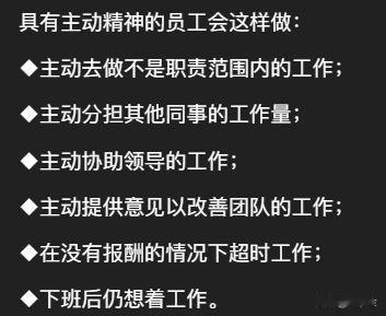 主动员工是这样定性的,今天你主动了吗?[狗头] 据说具有主动精神的员工一般会这样做: 主动去做不是职责范围内的工作,并积极完成! 主动分担其他同事的工作,并热情有礼! 主动协助领导的工作,并不要回报! 主动提供意见以改善团队的工作,并以身作则! 主动在没有报酬的情况下超时工作,并且没有怨言! 主动下班后仍想着工作,并且彻夜未眠! 主动去领导家里做家务,并养成习惯!