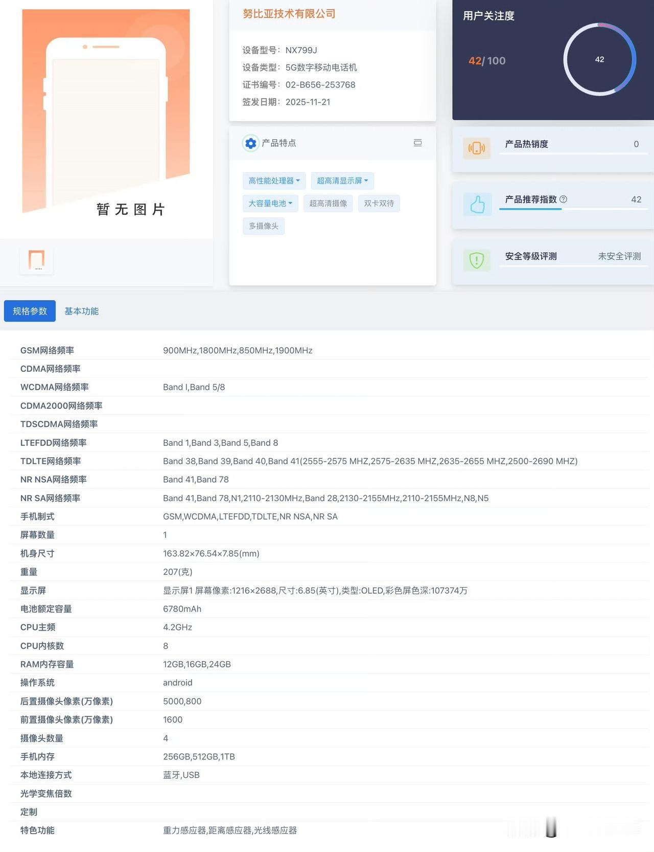 红魔 11 Air 工信部证件照出炉,型号 NX799J,依旧屏下摄像头,骁龙 8 至尊版处理器,厚 7.85mm,重 207g。 - 芯片:骁龙 8 至尊版,入网了至高 24GB 内存; - 屏幕:6.85 英寸 2688×1216 OLED 真全面屏; - 相机:前置 16MP,后置 50MP 主摄 + 8MP 超广角; - 续航:额定 6780mAh; - 其他:厚 7.85mm,重 207g,机身侧面有进风口,疑似有主动散热风扇驭风 4.0。