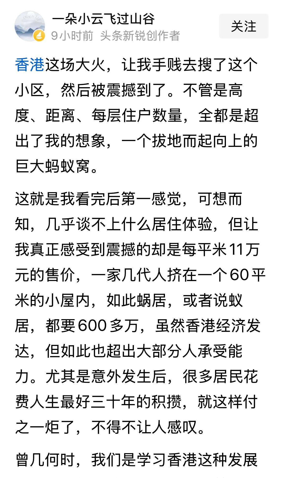 你说的是对的“虽然香港经济发达,但如此也超出大部分人承受能力”,香港人的确不容易。 高层楼60平米的套内面积相当于我们的85平米的建筑面积,总价600万,单价7万,约合人民币6.4万,太贵了,比内地贵多了,和上海北京差不多。