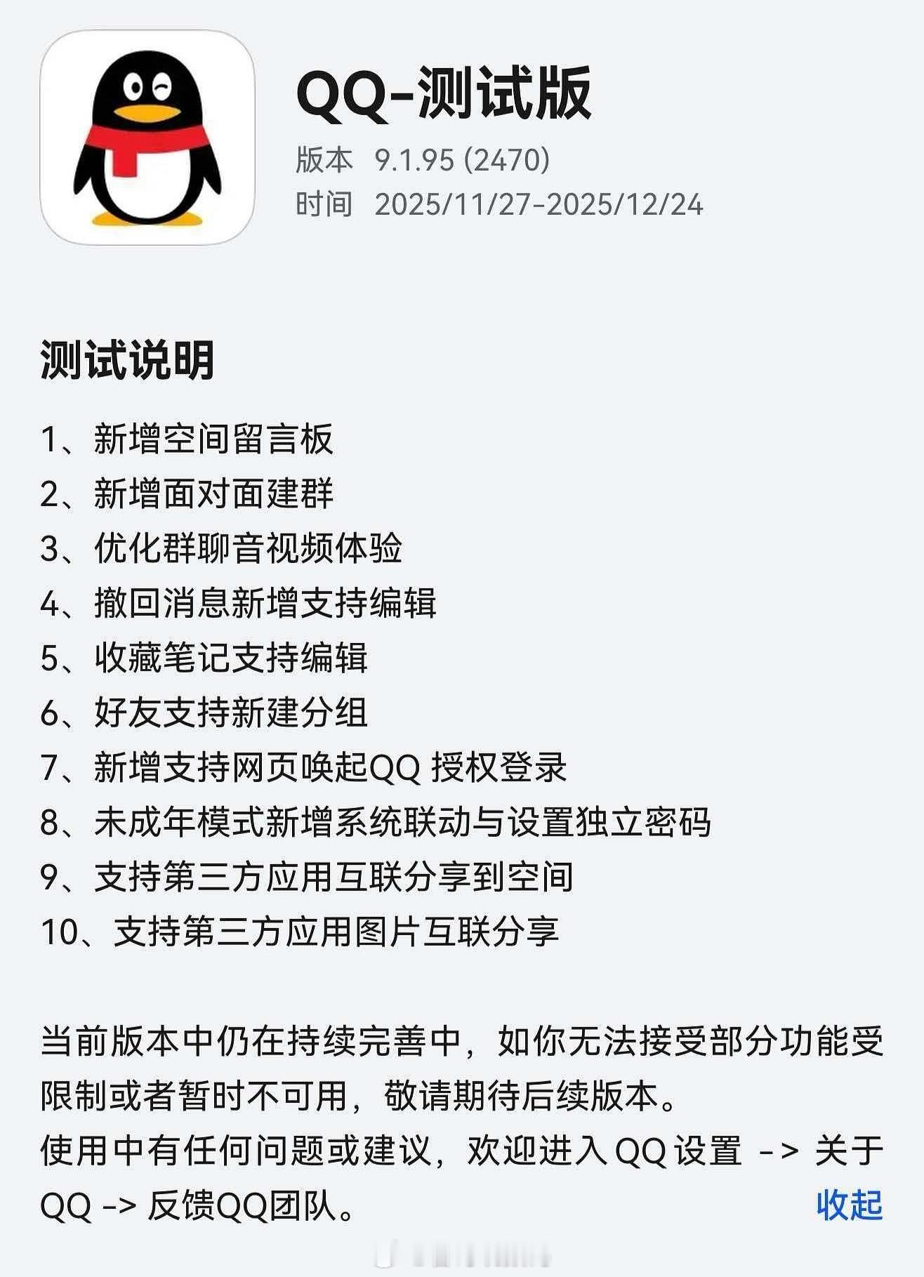 QQ鸿蒙版邀请测试9.1.95(2470)新版本,新增功能:1、新增空间留言板2、新增面对面建群3、优化群聊音视频体验4、撤回消息新增支持编辑5、收藏笔记支持编辑6、好友支持新建分组7、新增支持网页唤起QQ授权登录8、未成年模式新增系统联动与设置独立密码9、支持第三方应用互联分享到空间10、支持第三方应用图片互联分享很多教育相关行业的老师和同学们比较依赖QQ,至此功能基本完善。鸿蒙越用越香鸿蒙版QQharmonyos6