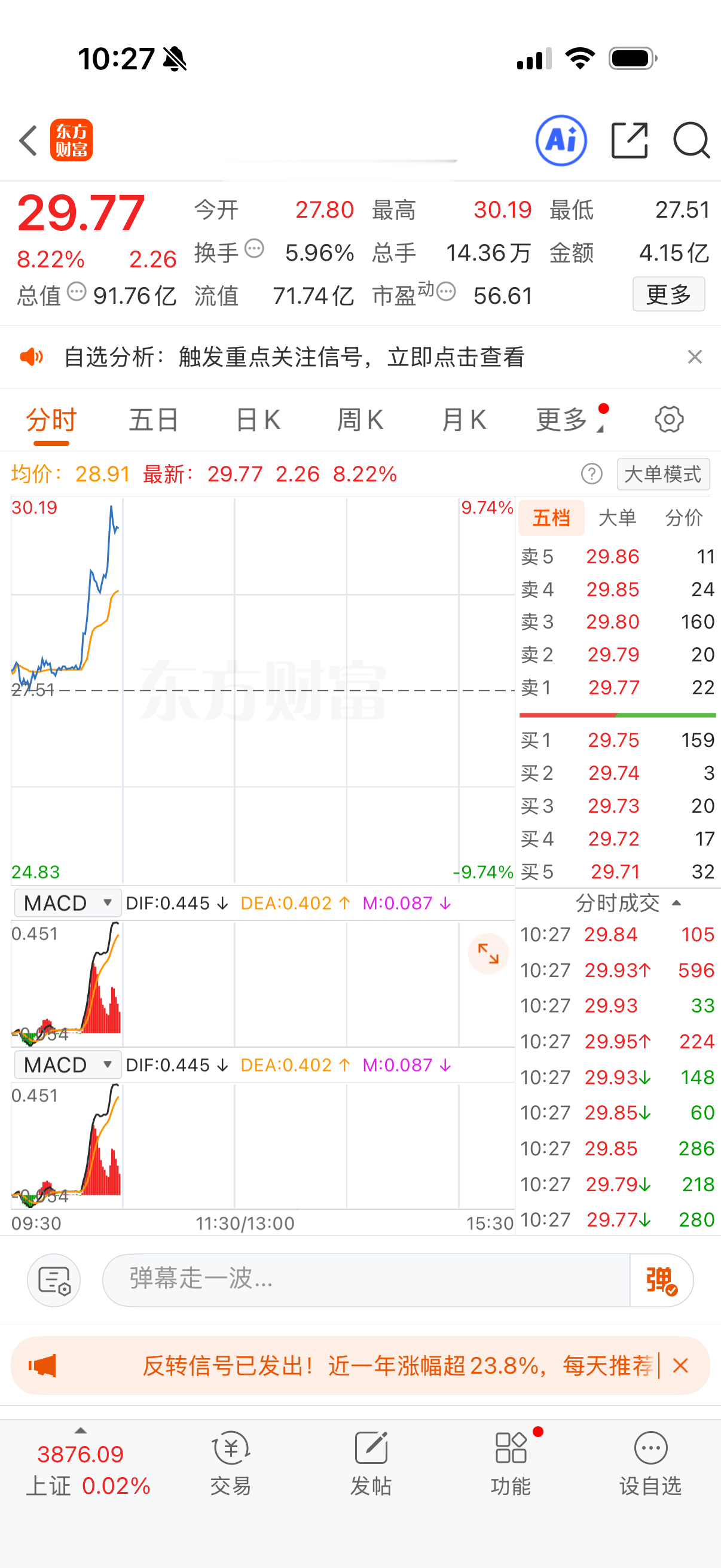 上证报中国证券网讯(记者何治民)11月28日10时左右,昊志机电异动拉升,一度涨超9%,截至10时27分,股价涨8.22%,报29.77元/股。