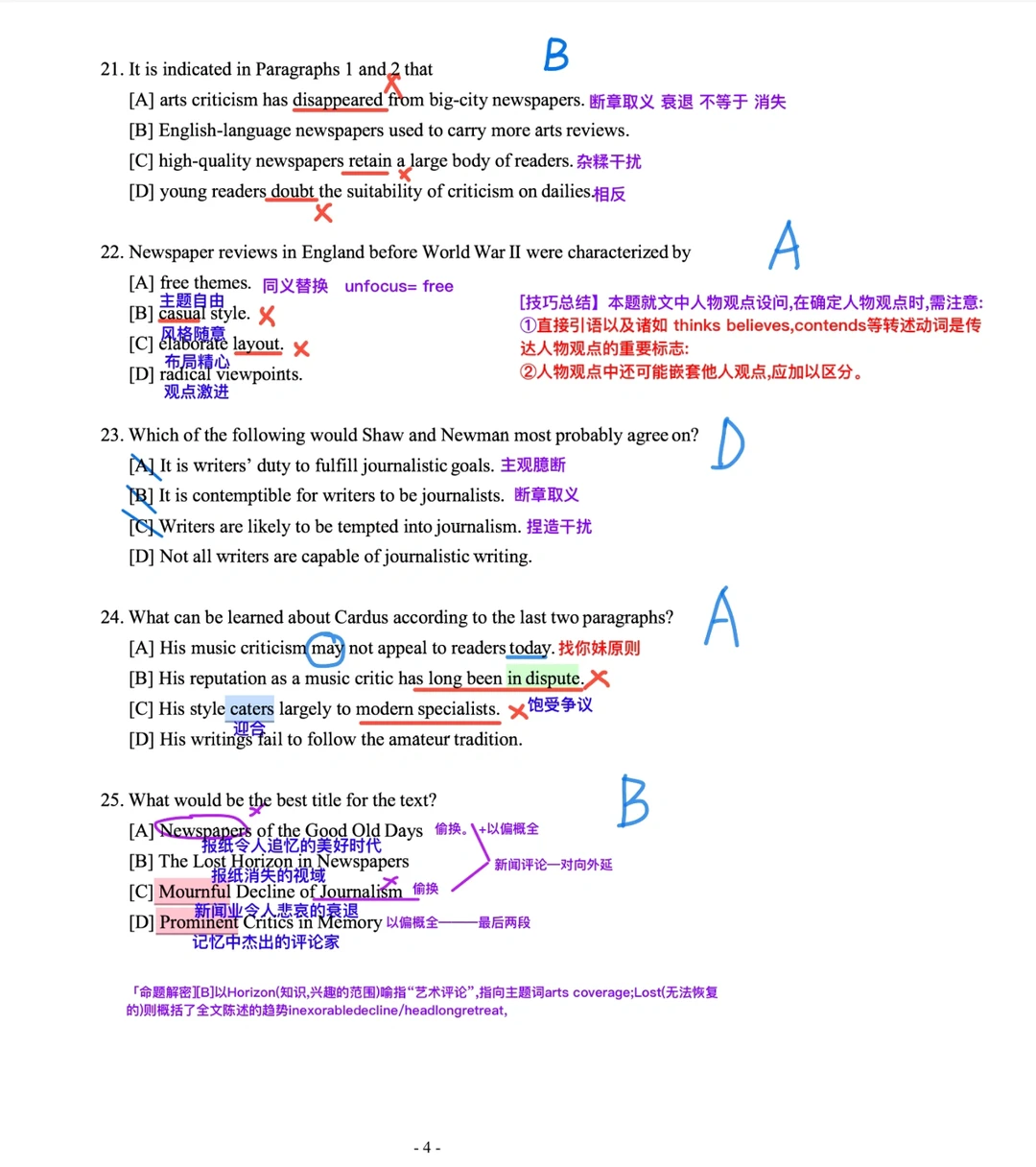 铅笔:紫色:段落分析;红色:解题关键;蓝色:单词释义;黑色:文章翻译