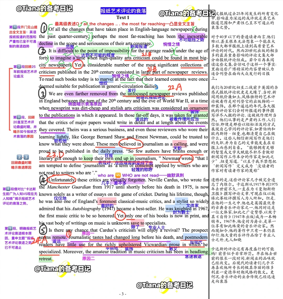 第4⃣️段借对比"卡达斯生前广为人知VS现在无人知晓”揭示报纸艺术评论的衰落之势。