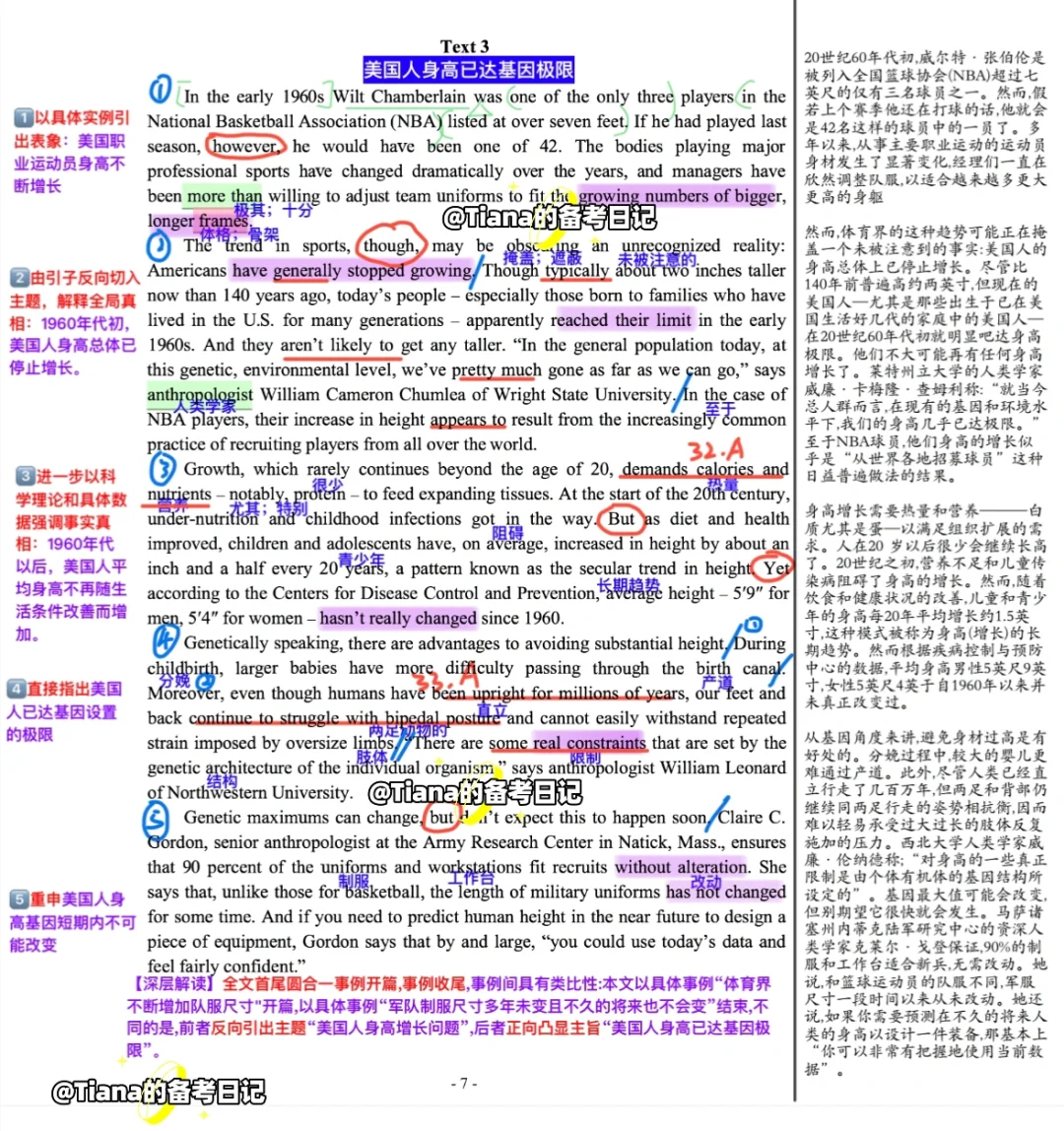 【深层解读】全文首尾圆合一事例开篇,事例收尾,事例间具有类比性:本文以具体事例“体育界不断增加队服尺寸"开篇,以具体事例“军队制服尺寸多年未变且不久的将来也不会变”结束,不同的是,前者反向引出主题“美国人身高增长问题”,后者正向凸显主旨“美国人身高已达基因极限”。