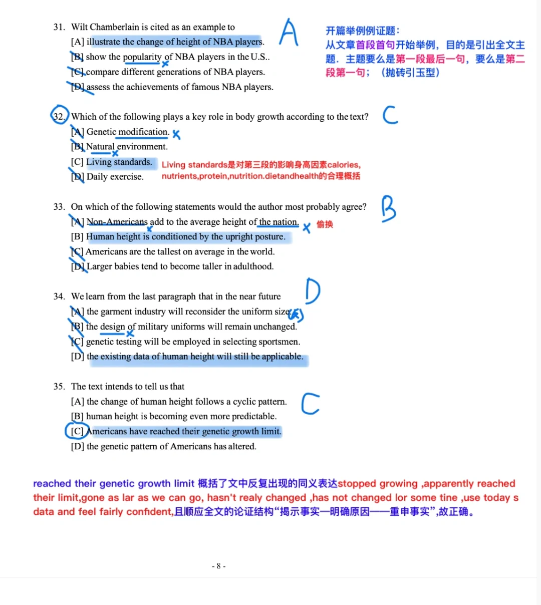 📙35 题:reached their genetic growth limit 概括了文中反复出现的同义表达stopped growing ,apparently reached their limit,gone as lar as we can go, hasn't realy changed ,has not changed lor some tine ,use today s data and feel fairly confident,且顺应全文的论证结构“揭示事实—明确原因——重申事实”,故正确。