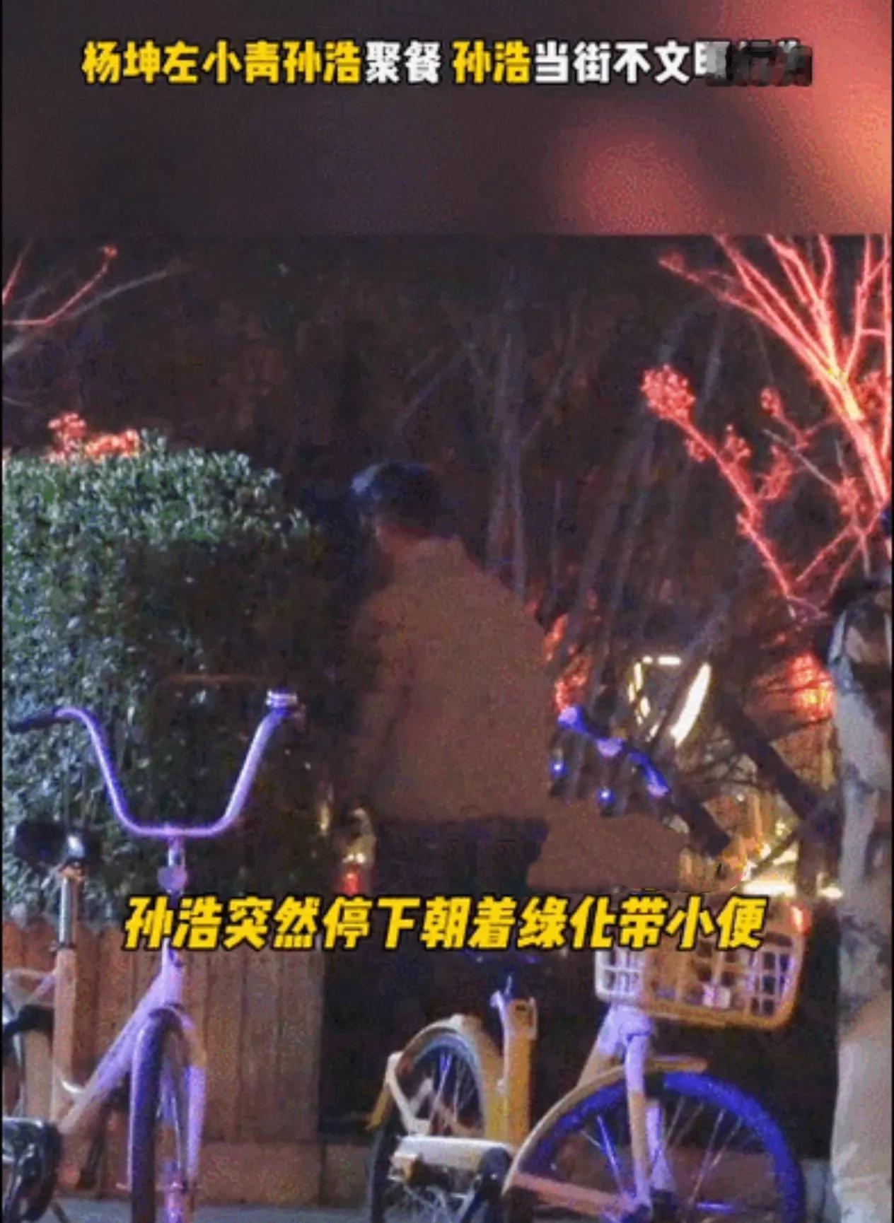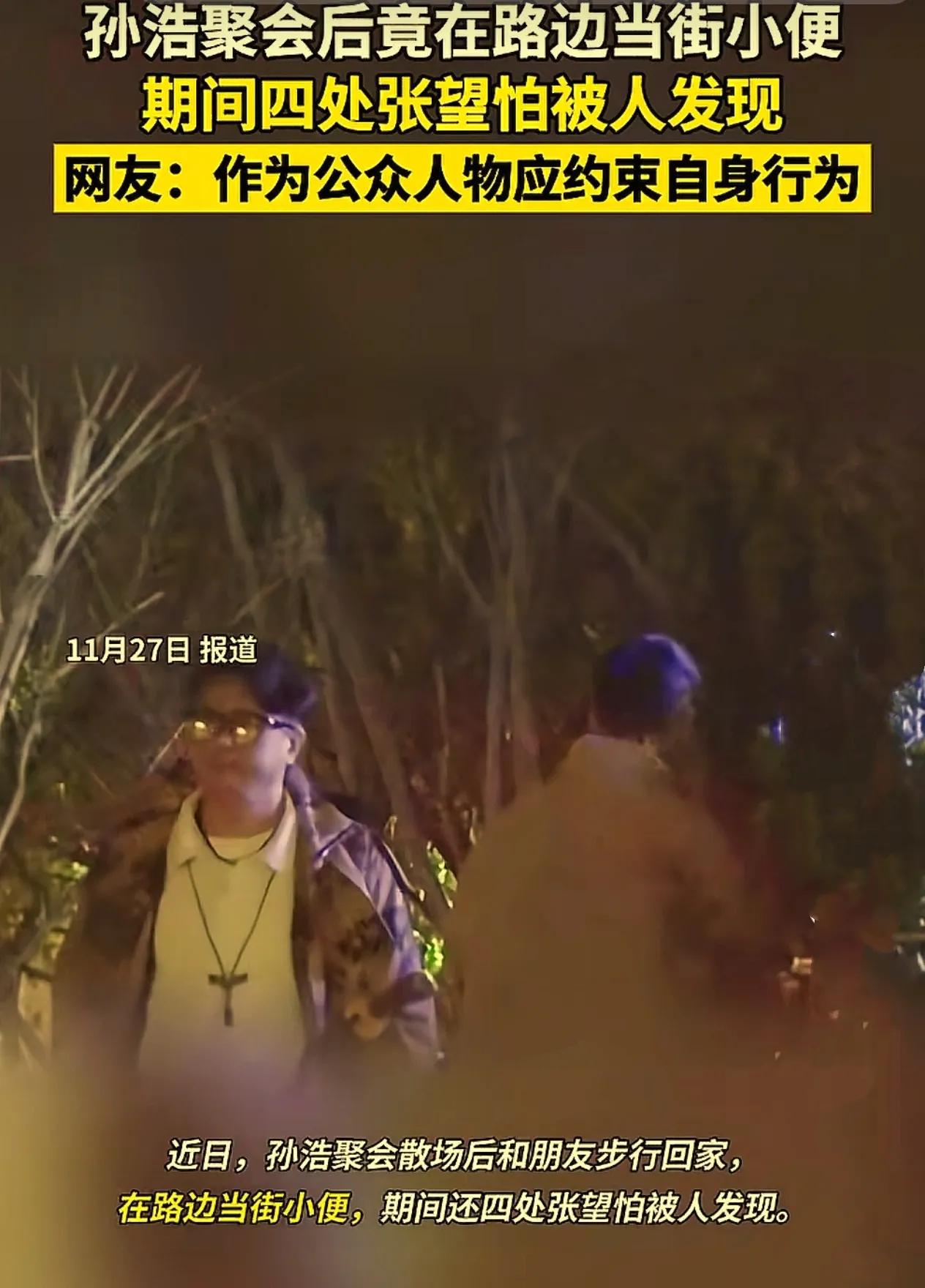 演员孙浩聚会后在路边当街解手! 近日,有网友爆料称演员孙浩在聚会后,竟于路边当街解手。视频中他步履蹒跚,在绿化带旁旁若无人地方便,着实不雅。作为公众人物,此举实在有失体统。无论何时何地,都应谨记文明底线。若确因饮酒过量,也应注意分寸,做好行程安排。希望当事人能引以为戒,公众人物更需以身作则,维护良好形象。