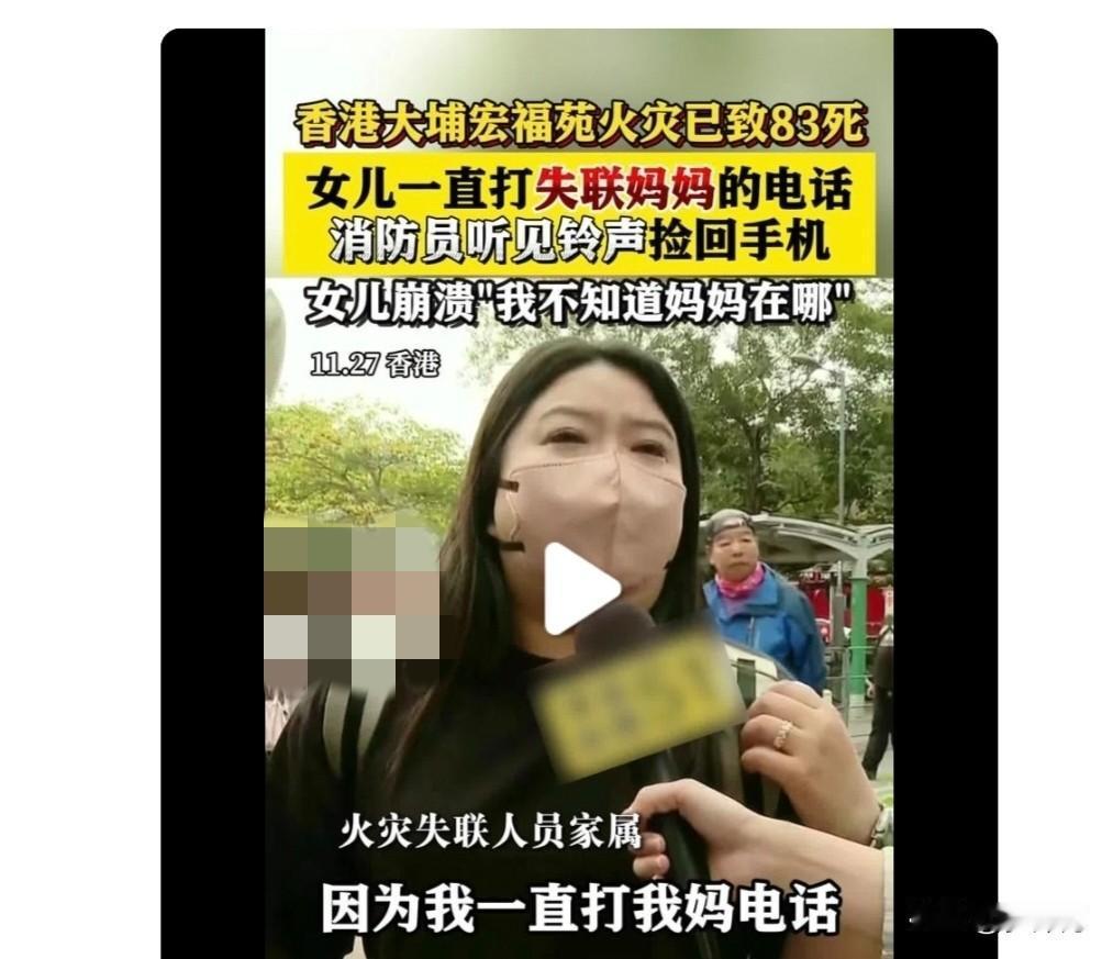 揪心的一幕:妈妈在香港大埔火灾中失联,女儿只拿到手机,但却找不到妈妈 截至11月28日5时,大埔宏福苑火灾已造成94人遇难。78名伤者中,有12人危殆、28人严重、16人稳定,22人已出院。 昨天看到新闻,有一幕让人揪心:一位女儿在镜头前哽咽,她一直尝试给妈妈打电话,但妈妈处于失联状态,消防员找到了这位妈妈的手机,把它转交给女儿,这位女儿看到手机几近崩溃,她急呼:“我不知道我妈妈在哪里!” 希望这位妈妈平安无事!