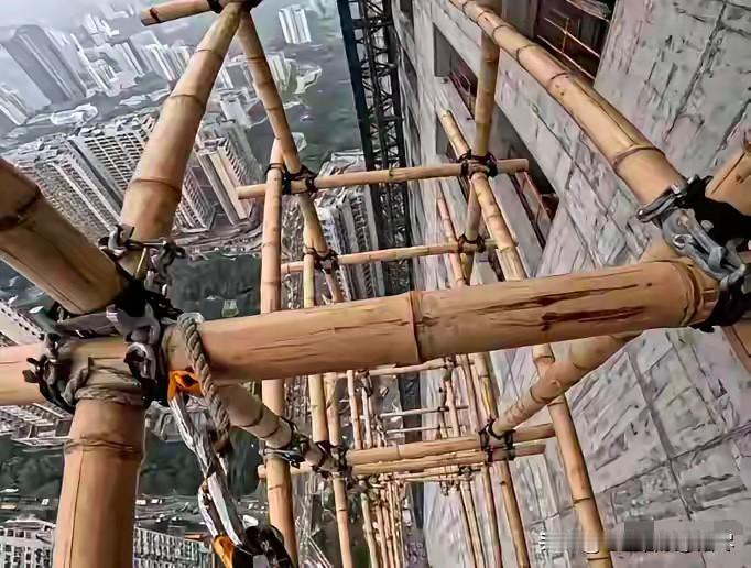 也不知道为什么,每次看到这种用竹子做的脚手架,我的内心都会产生一种莫名的担心! 看到在这么高的楼层,脚手架竟然还是用竹子做的,我真的很佩服敢站在这些脚手架上的工人们,因为对于体重180斤的我来说,感觉站在竹子的中间,会担心竹子由于承受不住我的体重,而突然发生断裂,感觉站在竹子的捆绑处,也会担心竹子长时间被捆绑受压磨损,也会突然发生断裂,反正这种用竹子做的脚手架,总是给我一种很不安全的感觉,不知道大家都有没有这种感觉呢? 另外我也很好奇,那些经常站在这种竹子脚手架上的工人们,他们就一点也担心竹子的安全问题吗?