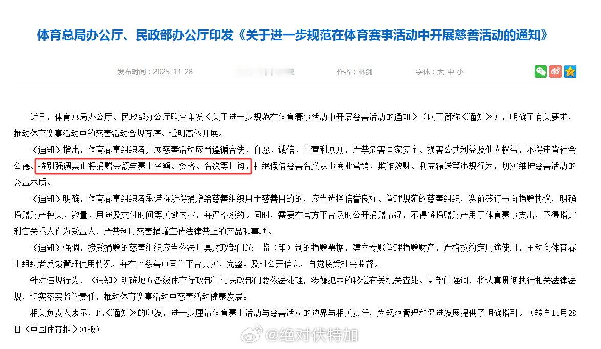 体育总局办公厅、民政部办公厅印发《关于进一步规范在体育赛事活动中开展慈善活动的通知》。其中“特别强调禁止将捐赠金额与赛事名额、资格、名次等挂钩”。估计短期内马拉松赛事的慈善名额是难出现了,除非有详细的举例解读马拉松 赛事组织 慈善