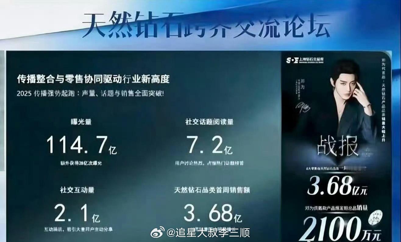 邓为上海钻石交易所官方战报来了!曝光量114.7亿,首周销售额3.68亿!!太🐮了!