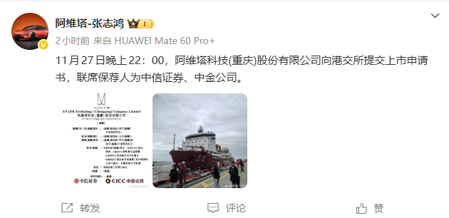 重庆将再增一上市车企 据高管微博消息,11月27日晚上22:00,阿维塔科技(重庆)股份有限公司向港交所提交上市申请书,联席保荐人为中信证券、中金公司。不久前赛力斯刚刚在港股挂牌,如今央企的子品牌也要独立上市了,雄起!