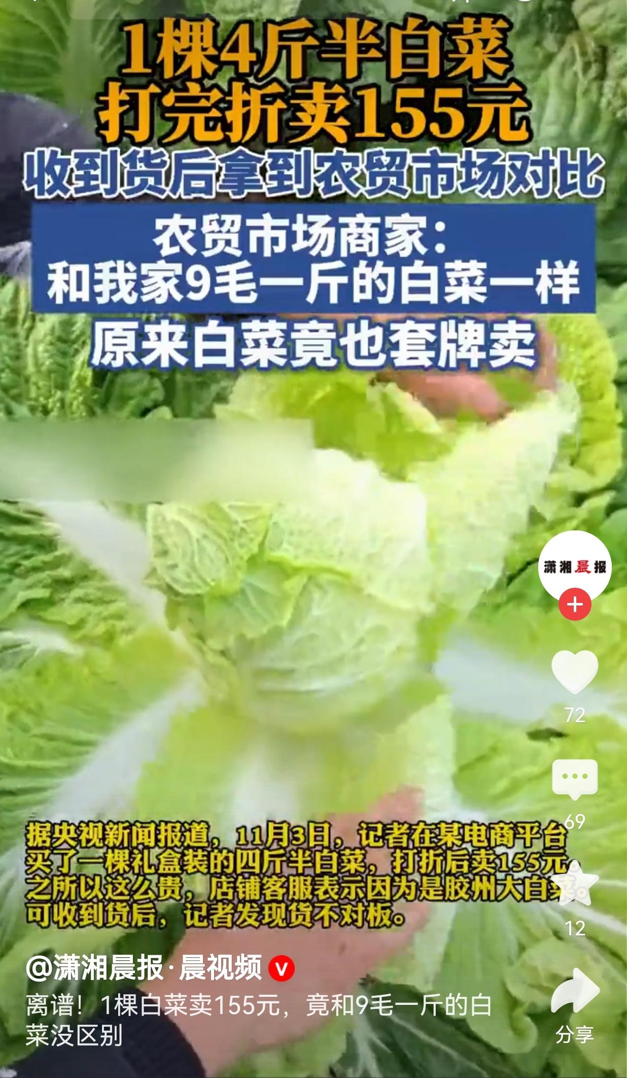 155元一棵白菜和9毛一斤的白菜一样一颗白菜卖155元,你买不?反正我是不买!不是买不起,而是值不值得的问题。事实一再证明,凡是违反自然规律和常规的事情,背后必然存在不可告人的“妖气”。白菜就是白菜,因种植地域不同,可能口感有所差异,难道还能吃出牛肉的感觉?这件事让我想起之前赵本山的小品《策划》,呵呵!这颗白菜难道也是“白菜中的战斗机”?