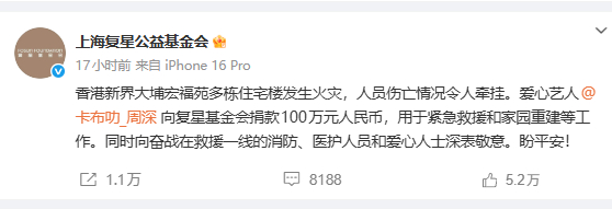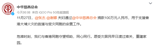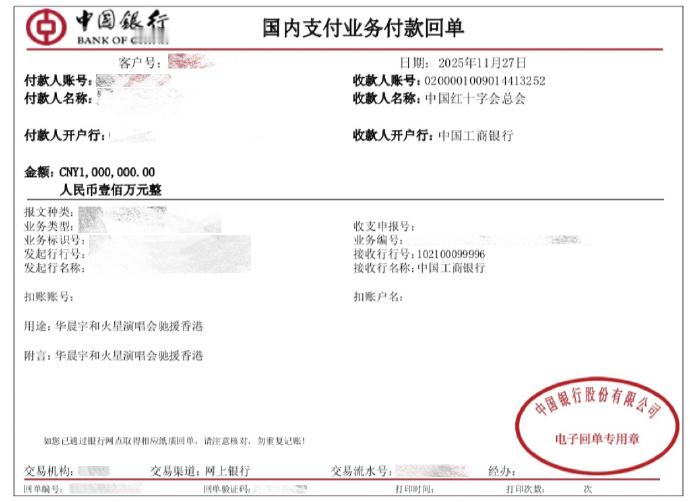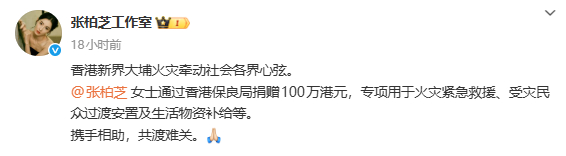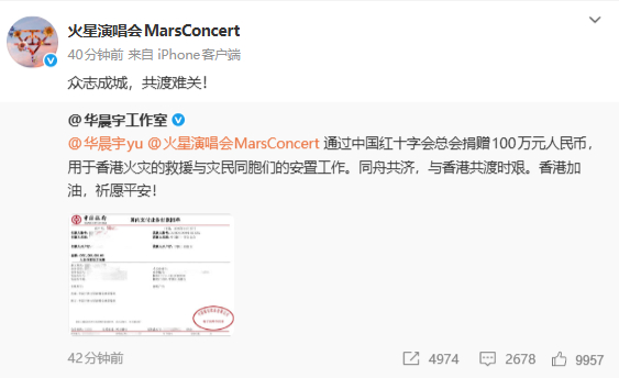 【众星向香港同胞捐款】华晨宇向香港同胞捐款100万26日下午,香港新界大埔宏福苑多栋住宅楼发生火灾,造成重大人员伤亡。多位艺人通过各方渠道向香港同胞捐款,共度时艰。通过中国红十字会总会捐赠100万元人民币;向东华三院甘霖援急基金低调捐款100万港元;向基金会捐款100万元人民币;夫妇通过捐款100万元人民币;捐赠1000万元人民币;通过香港保良局捐赠 100 万港元;演唱会首场收益及6场周边产品所有盈利全部捐出。