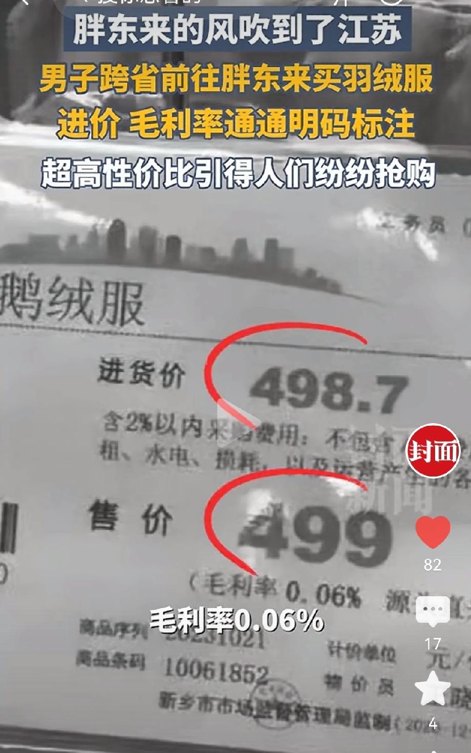 作为一个河南人,我一直都很支持胖东来,但是现在胖东来的一些做法,让我的确是不敢相信啊,你就像这个羽绒服真的只挣几毛钱?那他们图的是啥?这不符合原理呀!是到底是为了促销?还是清理货底?这总得有个原因吧?