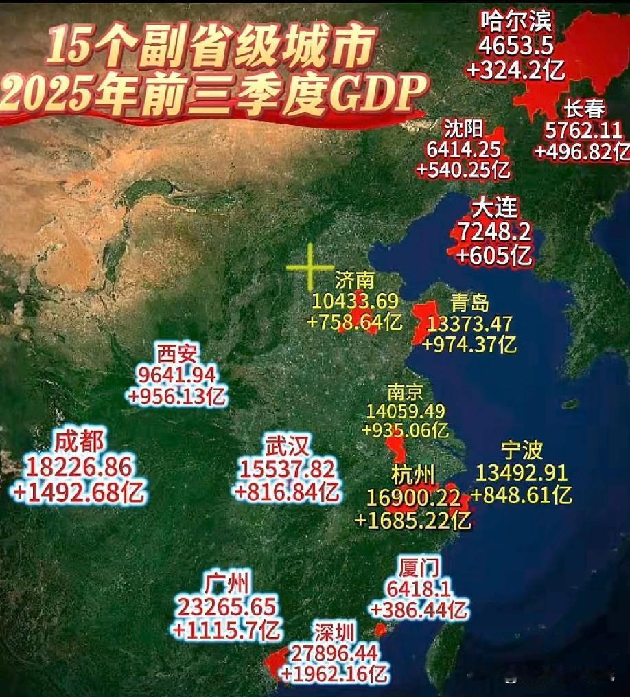 2025年前三季度副省级城市经济发展表现水平情况,副省级城市深圳前三季度经济增长量以1962.16亿元人民币排名榜一,可见前三季度副省级城市深圳经济增长量最高。