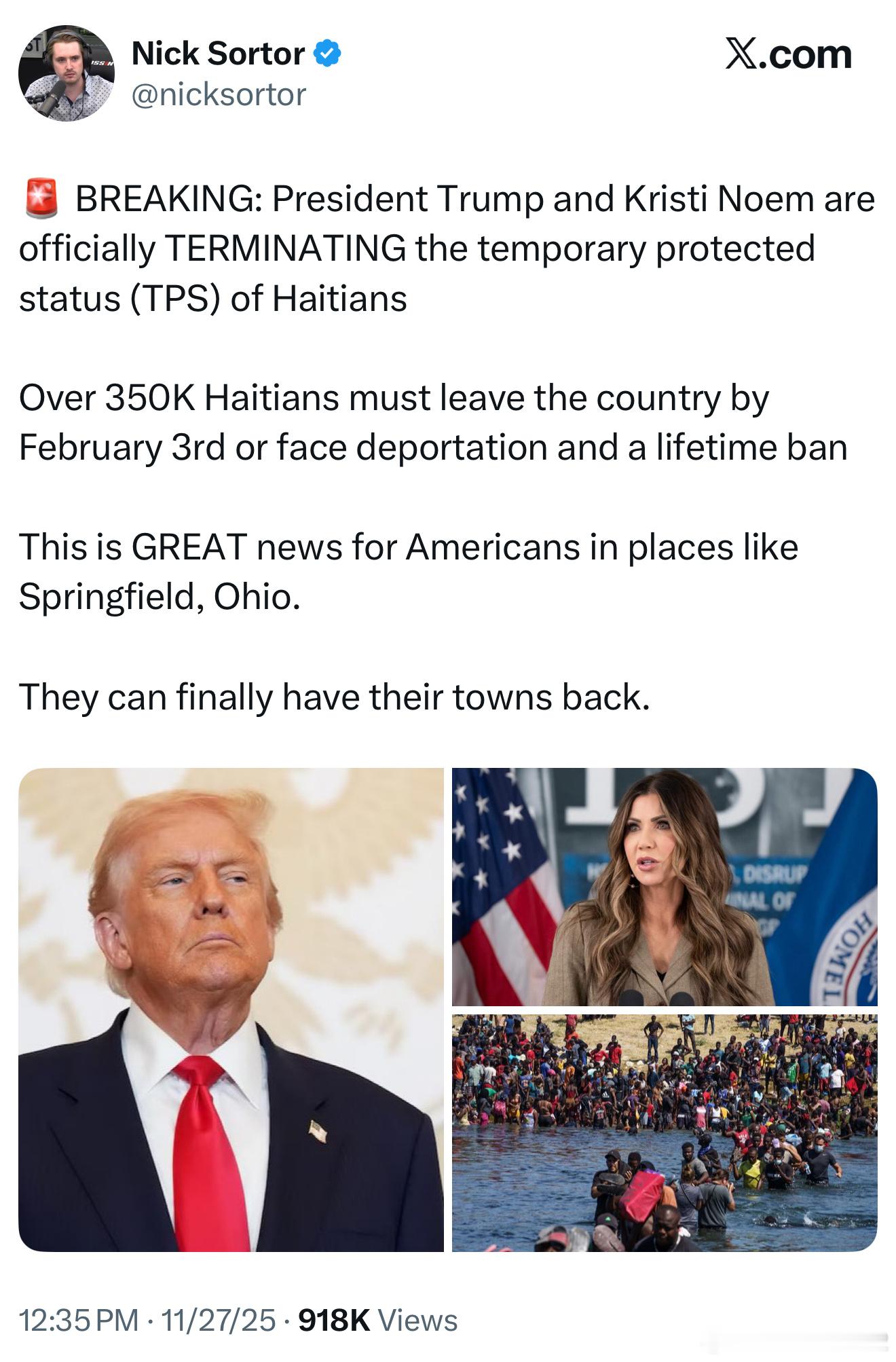 突发:川普总统和国土安全部长克里斯蒂·诺姆正式终止海地人的临时保护身份(TPS)。超过35万海地人必须在2月3日前离开美国,否则将面临遣返和终身入境禁令。这对俄亥俄州斯普林菲尔德等地的美国人来说是个好消息。他们终于可以重新拥有自己的家园了。