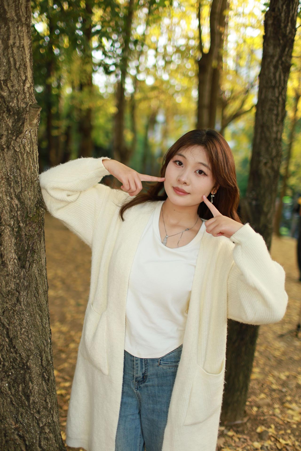 暖冬,银杏树林,小姐姐~~偶遇柳候公园,小姐姐微笑伴在风中,尽情释放自己!~~文