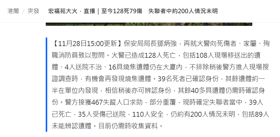 🔻香港特区政府保安局局长邓炳强表示,截至目前,大埔宏福苑火灾已造成128人遇难,不排除稍后警方进入现场调查时再发现遗体。仍有约200人情况未明。香港火灾仍有约200人情况未明香港大埔火灾已致128人遇难热点现场
